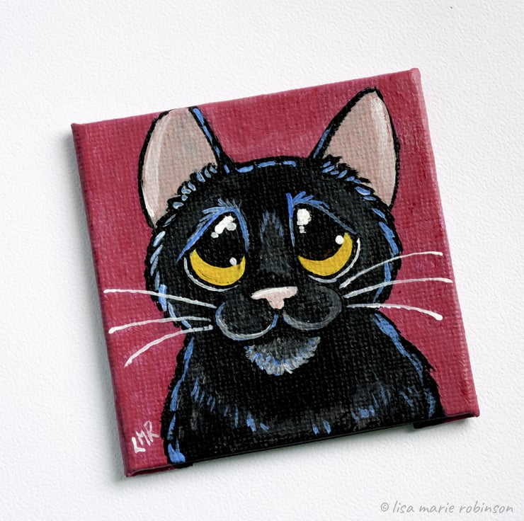 Cute mini canvas magnet featuring an original one of a kind cat painting by Lisa Marie Robinson.