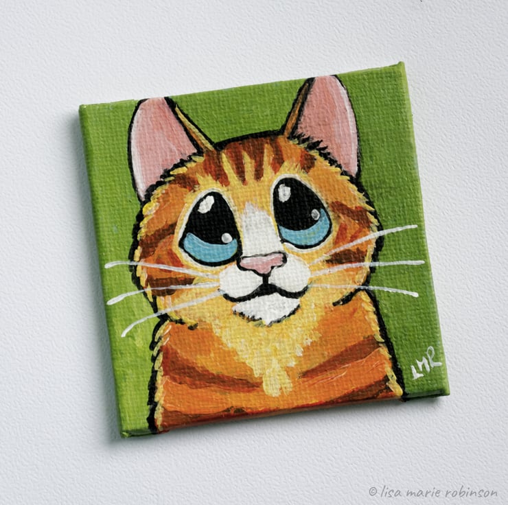 Hand painted with acrylics. This mini canvas magnet is perfect for cat lovers and features an original one of a kind cat painting by Lisa Marie Robinson.