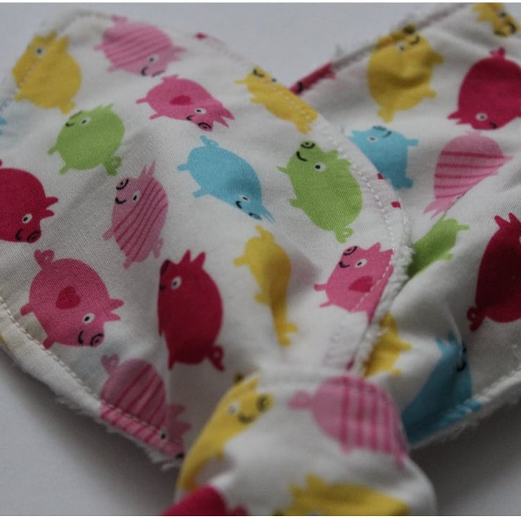 These are a fun and easy to hold teether ring. The 'ears' are made from 100% cotton with a bamboo fabric backing. Bamboo is a sustainable fabric, and has a natural antibacterial element. They are easy to hold for little hands and the ears are easily removed for washing.