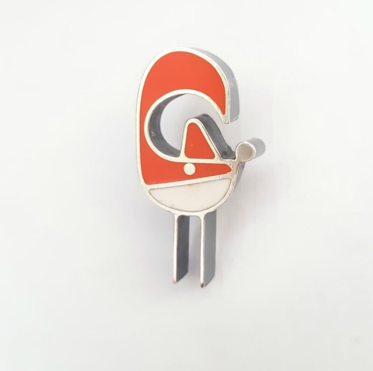 It is made in sterling silver using hand cut strips of metal that are then formed and soldered individually onto a base, then each section is painstakingly filled with hand mixed coloured resin that is polished to a shiny finish.