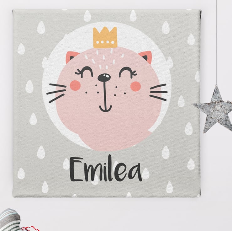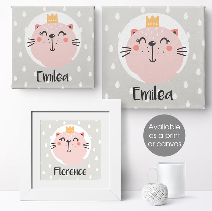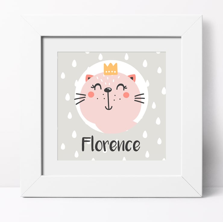 This Kitten Princess personalised print is a perfect gift for a little girl or cat lover! Personalised with your chosen name, it features a soft neutral background and pretty pale pink. A cute kitten complete with crown, this appealing print will look delightful in a nursery or bedroom. Perfect as a gift for a new baby girl or a baby shower gift. Your little princess will absolutely love this picture! (See my shop for the matching Bear Prince design)