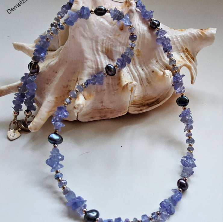 This beautiful dainty looking necklace has a luxurious feminine look which is ideal for those whom like a softer approach to accessorising their neckline with grace. It has been designed and hand crafted in Cornwall using AA grade tanzanite nuggets with tiny A grade faceted roundels, complimented with deep blue tiny genuine freshwater pearls. The finished length is 18" inches.