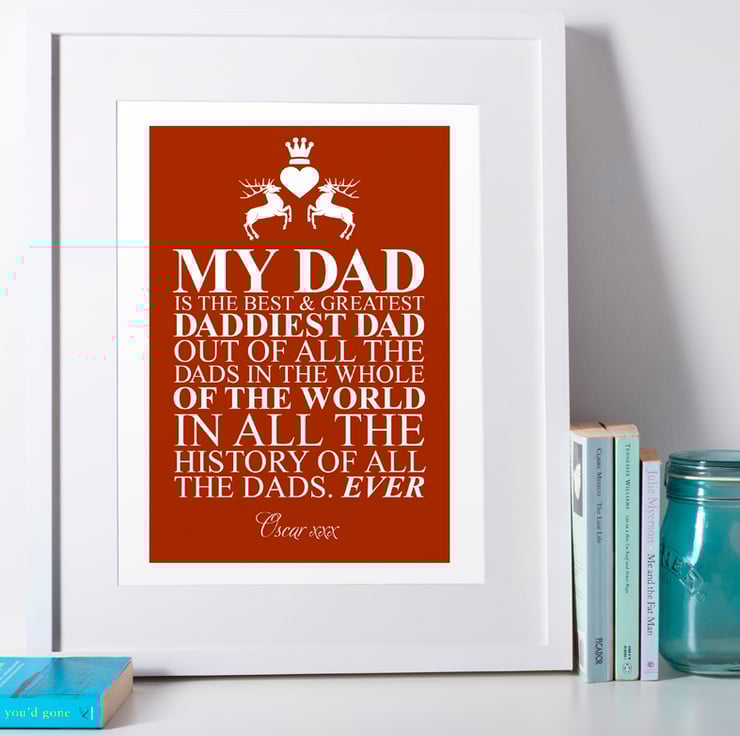 Leave your Dad in no doubt about how much you love him! This personalised Father’s Day print is the perfect way to tell everyone that you have the best dad in the world. Perfect for Dad’s & Grandad’s, this fun print is ideal for Father’s Day, birthday or Christmas. Leave Dad in no doubt that you love him to bits!