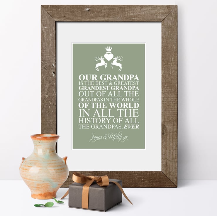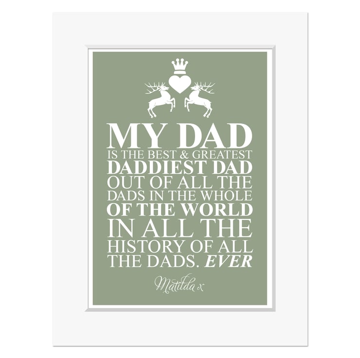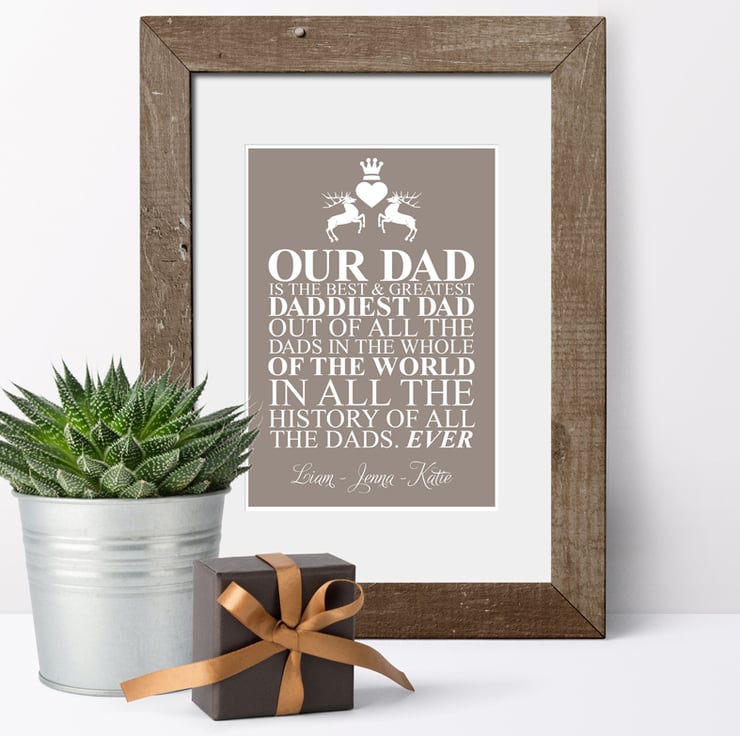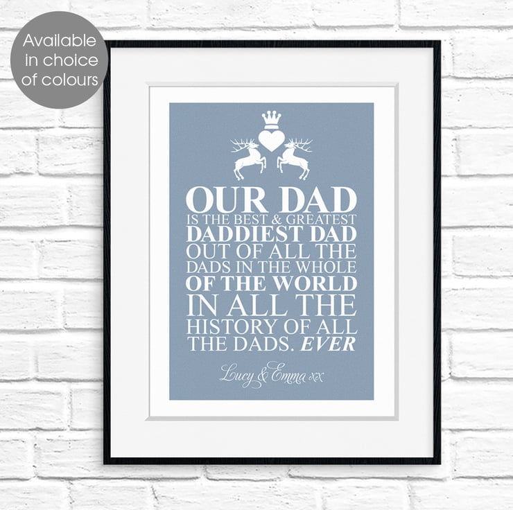 This personalised Father’s Day print is available in a range of colours but if you want something different to the colours in the examples just let me know. The wording can be adjusted to read either ‘Our Dad’ or ‘My Dad’, and you can change the name to ‘Dad’, ‘Grandad’ or ‘Grandpa’. The print can also be personalised with one line of text.