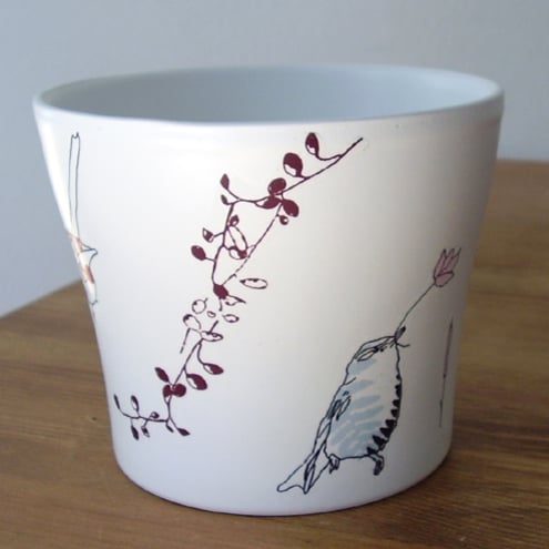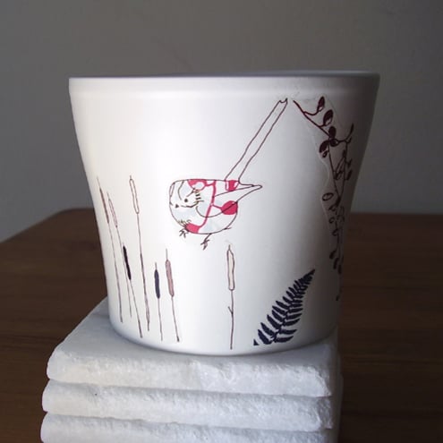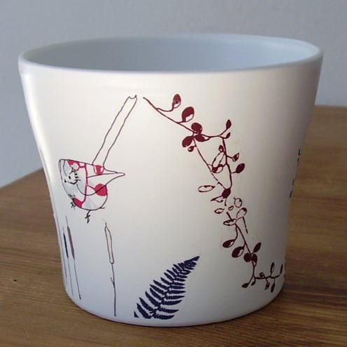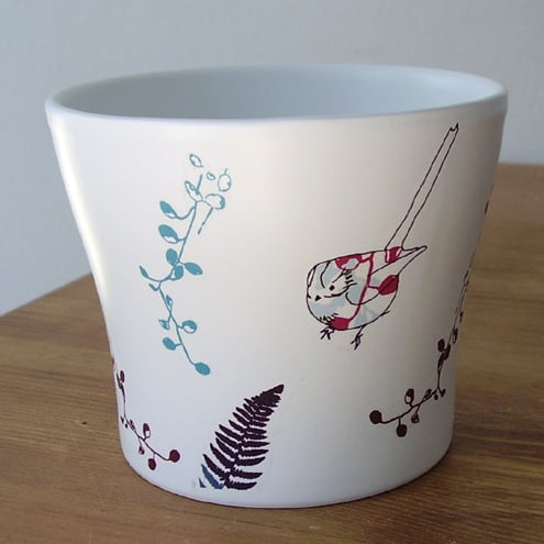 This is a small, white, ceramic plant pot for indoor use which i have decorated with my original littlebirdy designs.