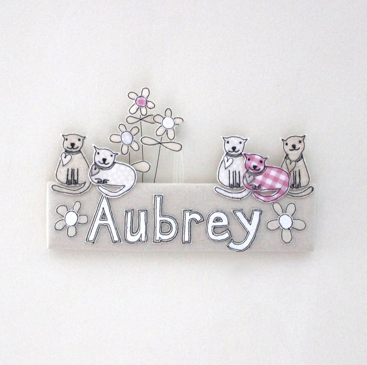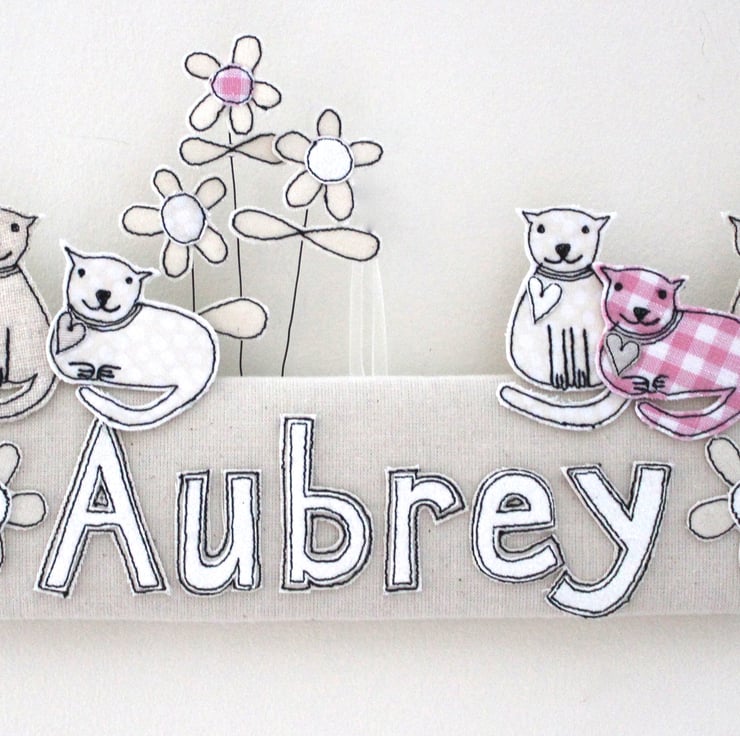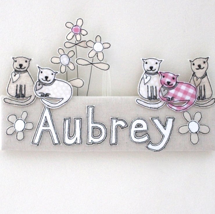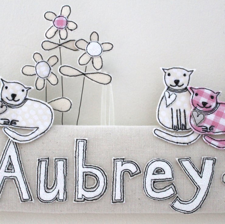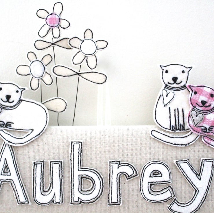 The letters, cats and flowers are sewn using layered cotton and glitter fabric. The plaque you will receive will be in pink fabrics but may differ slightly from the photographed design.