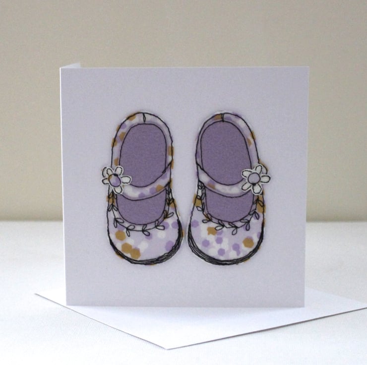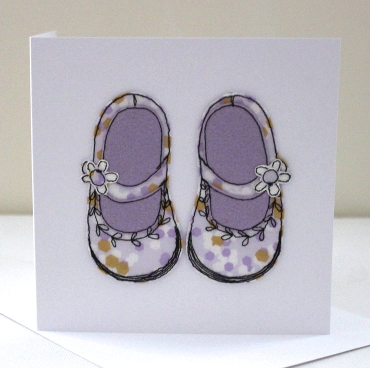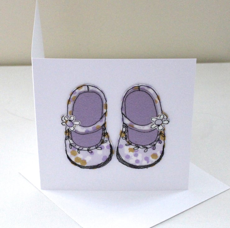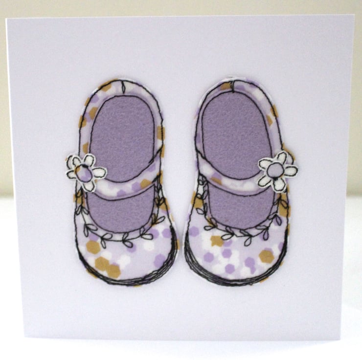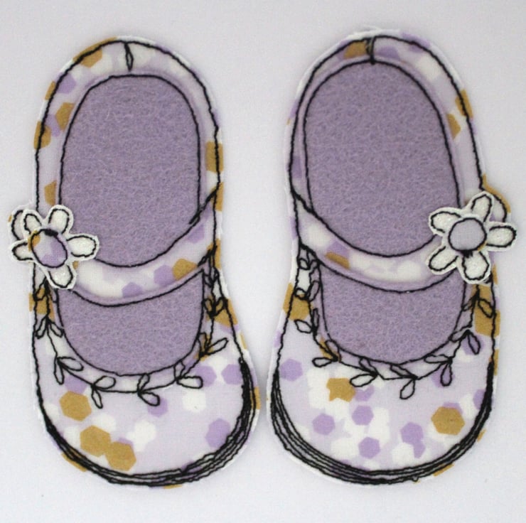 A little pair of shoes, with glitter flowers, evoking the image of little feet and the arrival of a new baby.