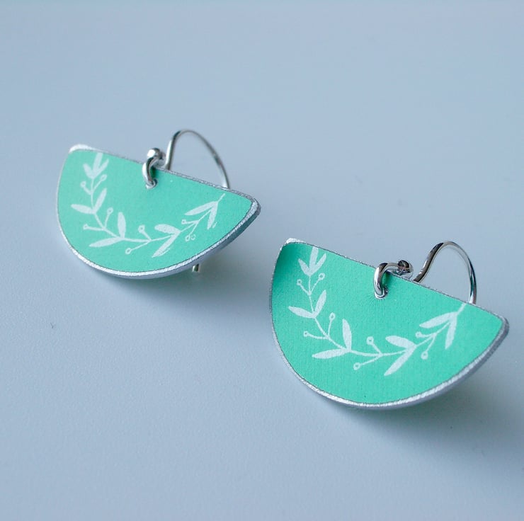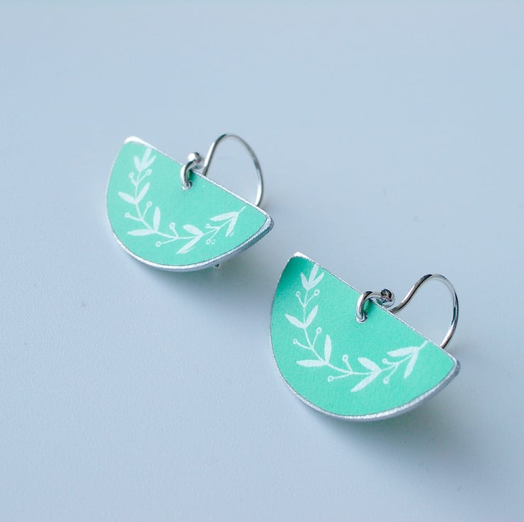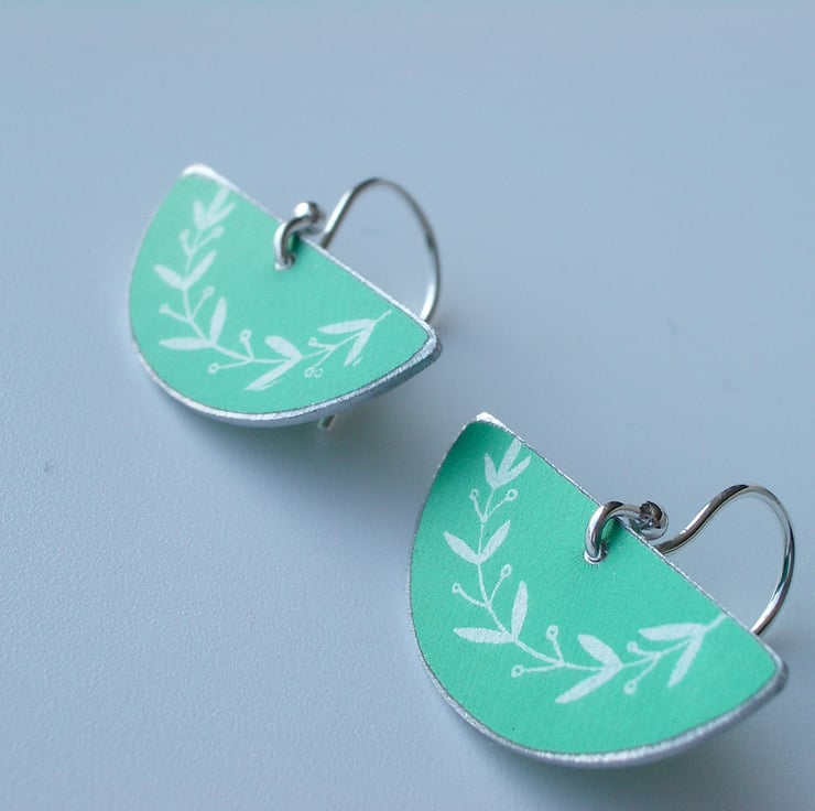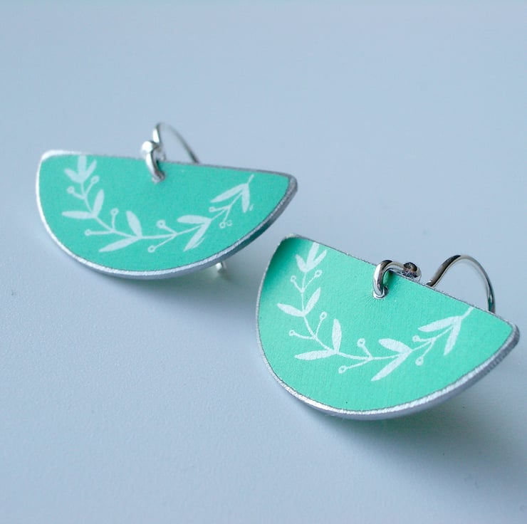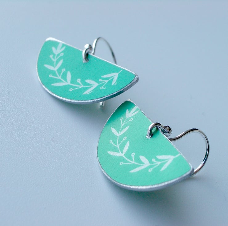 These semi circle earrings are made from aluminium which is hand dyed by me in jade green and printed with a silver circular wreath of olive leaves. I then cut out the semi circles with a piercing saw and file the edges to reveal the shiny aluminium underneath.