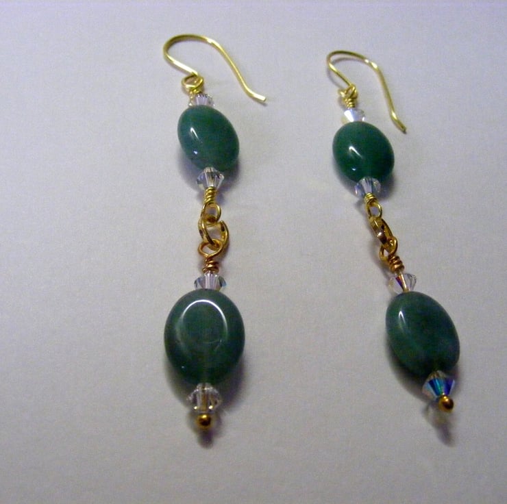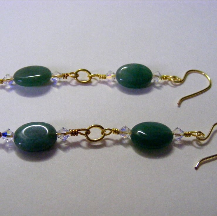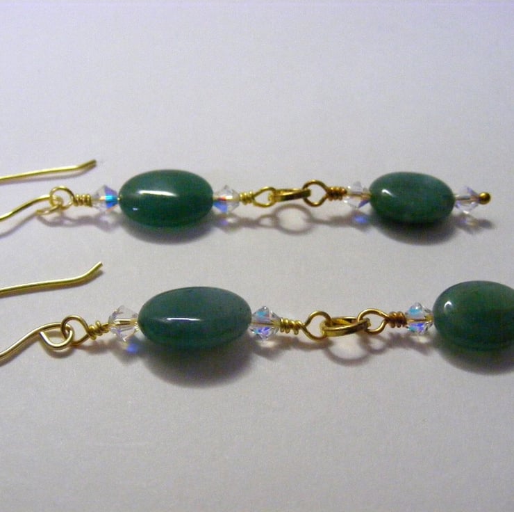 I have made these one of a kind gemstone earrings using 13 x 10 mm green adventurine ovals, 4 mm crystal AB Swarovski crystal elements and gold plated findings.