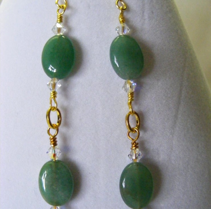 Swarovski crystals and adventurine are threaded and wrapped on ball headpins and also on lengths of wire wrapped at both ends. These are linked together with jump rings. Handmade ear wires are attached to complete the earrings.