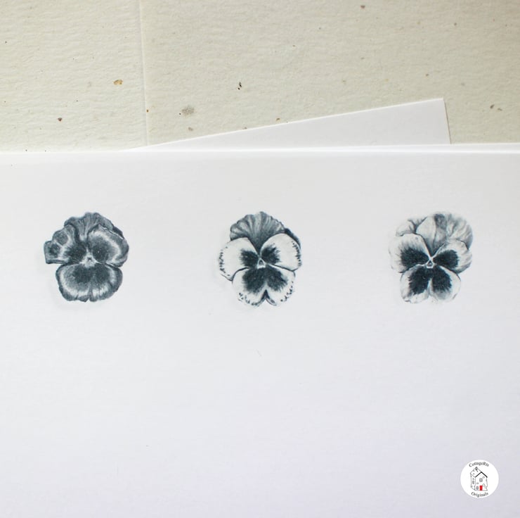 The pansies for this design were originally hand drawn using graphite pencil by us at CottageRts before being printed on to letter writing paper and envelopes.
