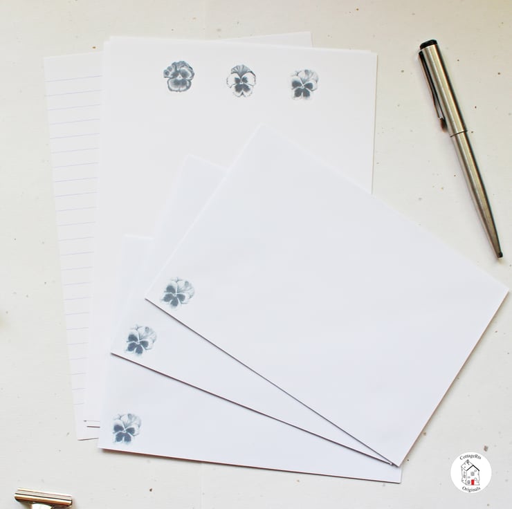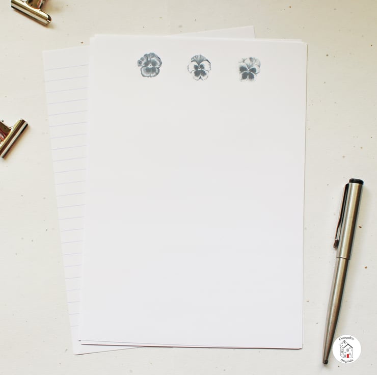 - 10 sheets of A5 100gsm laid letter writing paper with the pansy design heading the paper.