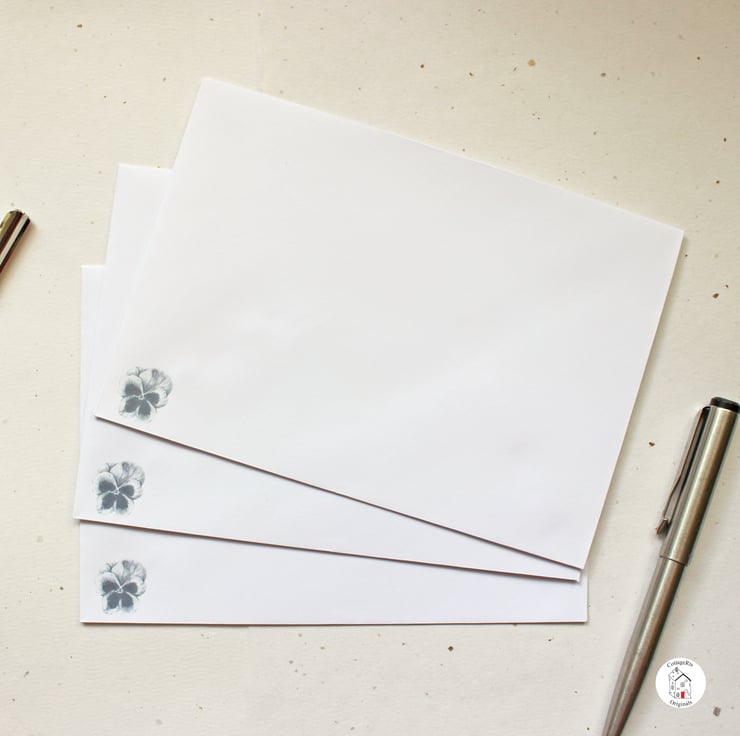 - 5 white C6 white envelopes with a pansy in the left hand corner.