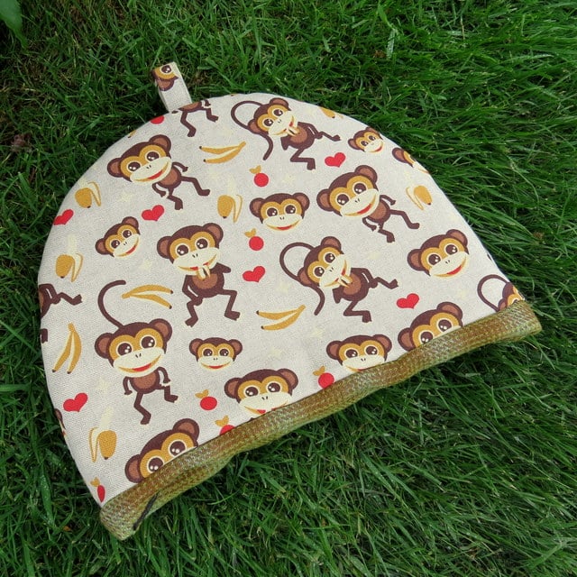 This tea cosy is made from a medium weight cotton fabric with a monkeys design.
