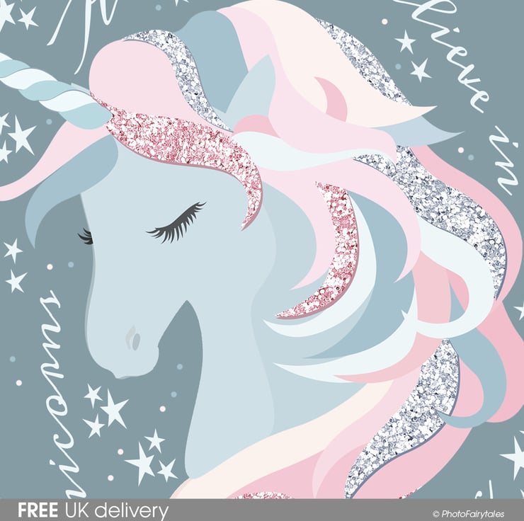 Everyone should believe in magic and unicorns! This gorgeous unicorn print is created to order and with it's pretty feminine design it will make a lovely finishing touch in a little girl's bedroom or a sweet gift to welcome a new baby girl. The print features a soft and smoky blue background with pretty touches of pale blue and pink. It has a sparkly glitter effect and features the wording 'Always believe in magic and unicorns' (please note it doesn't actually have glitter applied.).