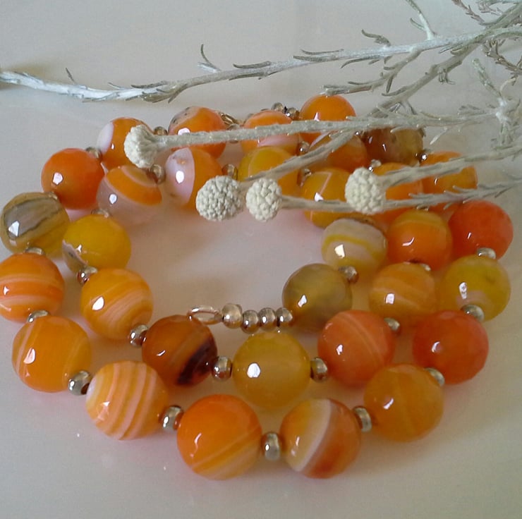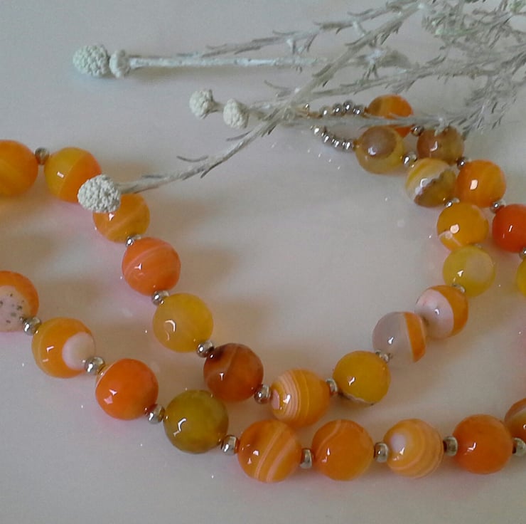 A very simple design, yet sophisticated necklace created from bright stripey orange genuine faceted agate gemstones, each one is 12mm in size. This will be an ideal gift for all year round wear by someone whom appreciates and values gemstone jewellery as apposed to glass or fake mass produced jewellery found in expensive accessories fashion chain stores throughout the country and on the Internet. It will appeal to ladies of all age groups and skin tones.