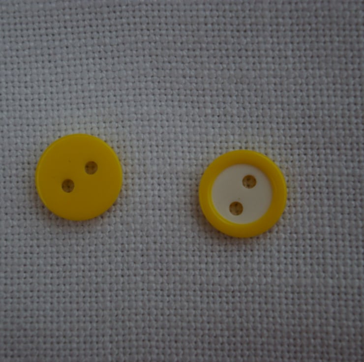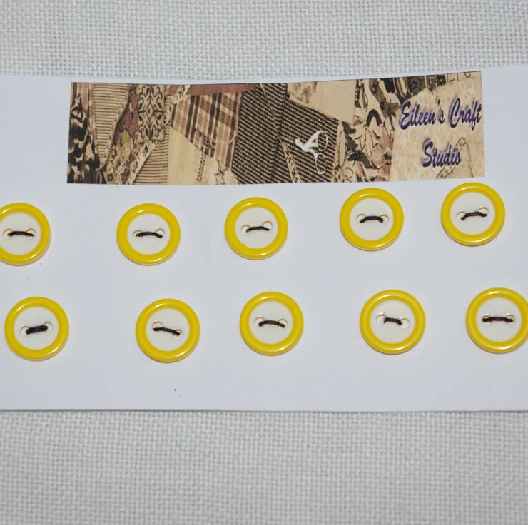 Ten tiny white and yellow plastic buttons. These tiny buttons are white in the centre and have a band of yellow around the edge. The reverse side of each button is the same yellow colour as the band of yellow on the front.