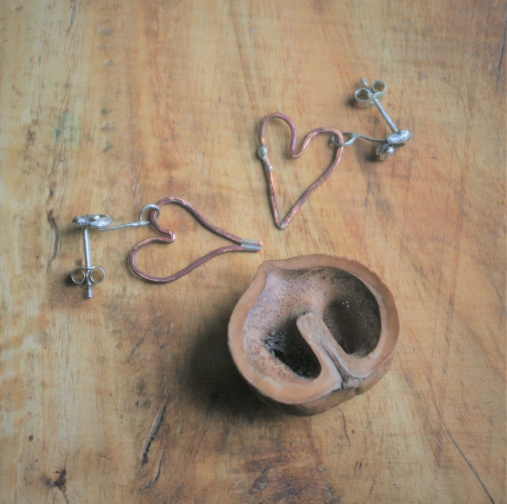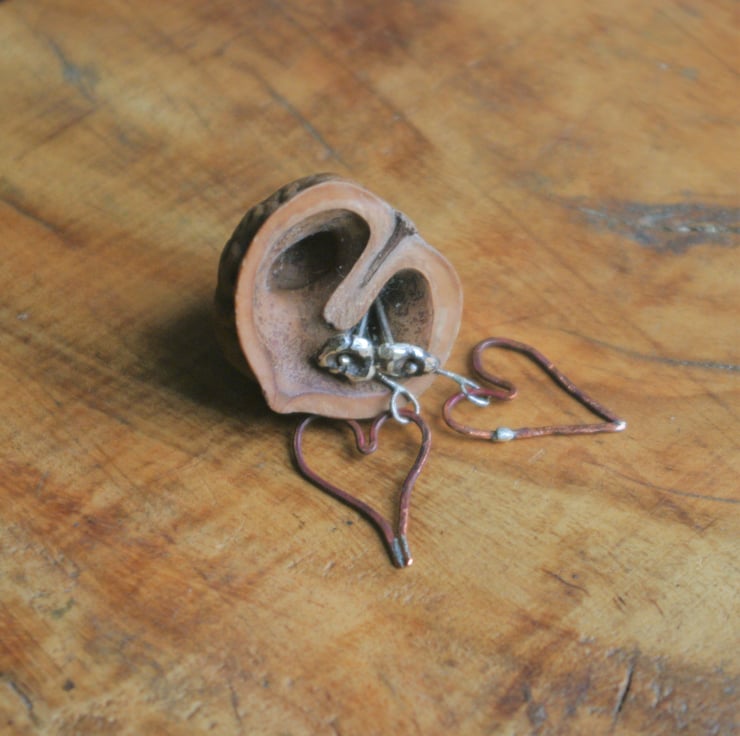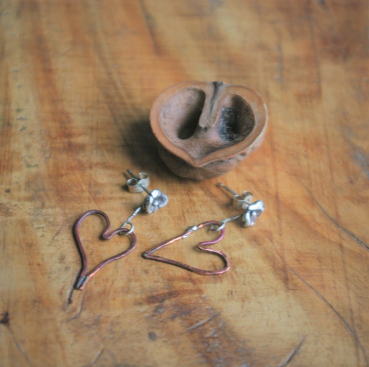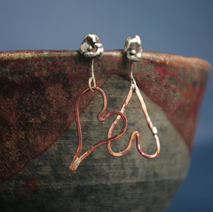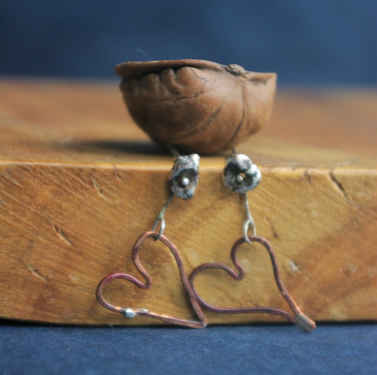 A copper heart ,18mm in length, dangles from a nugget of sterling silver. They are attached together by a thin piece of silver wire which is soldered closed and allows for movement of the dangly heart.