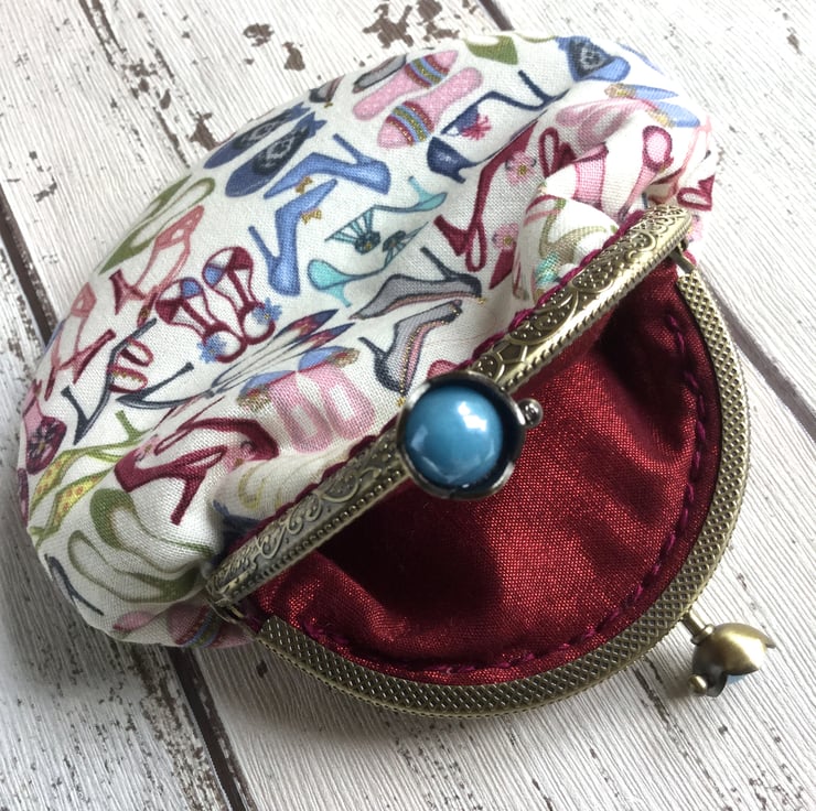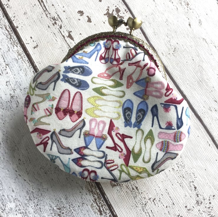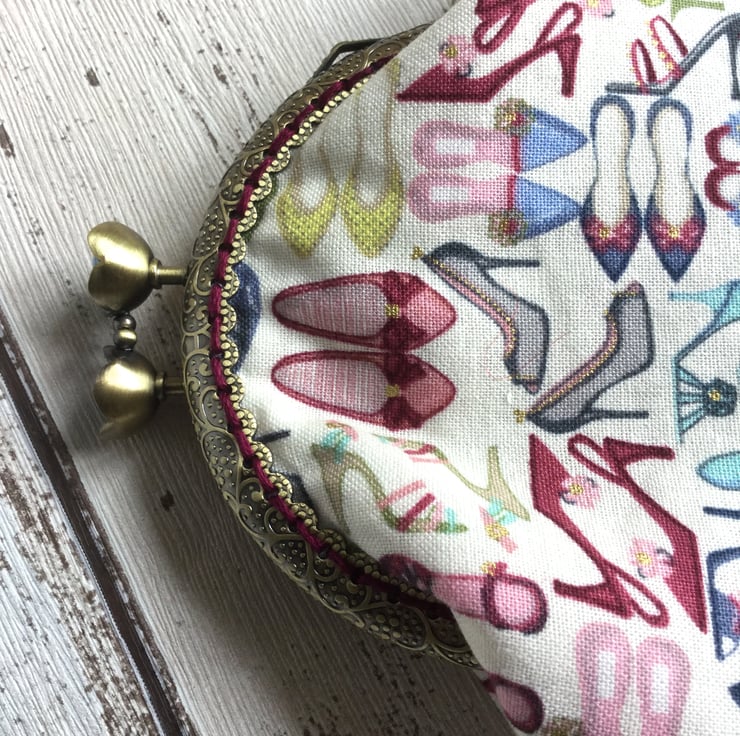 This delightful little purse has a pretty design of tiny shoes in shades of maroon, pink, green and blue with details highlighted in a metallic gold.