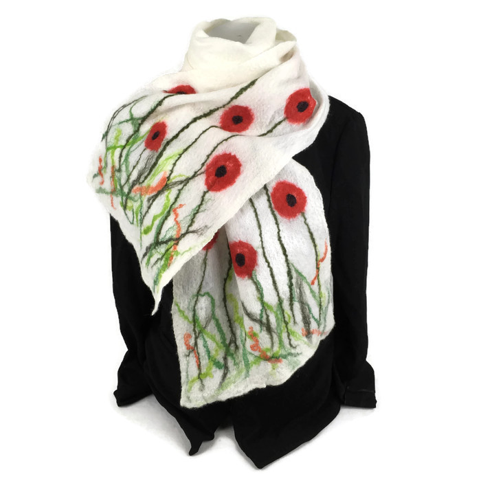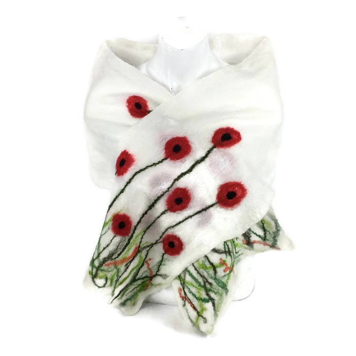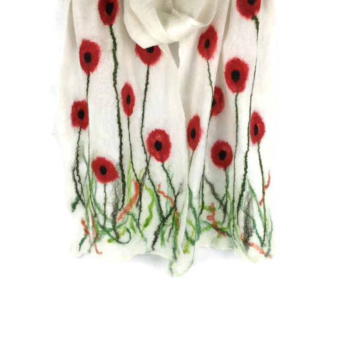 A gorgeous, unique and striking nuno felted poppy scarf. White merino wool fibres have been used for the body of this scarf with large poppies added to one side in red merino wool. Various wool and silk fibres have also been added along the bottom edges to create the "grass". The scarf has then been nuno felted, a process which causes the woollen fibres to migrate through the silk and bind with it during the felting process. The resulting scarf is super soft and lightweight and would make a superb addition to any outfit.