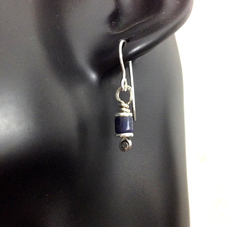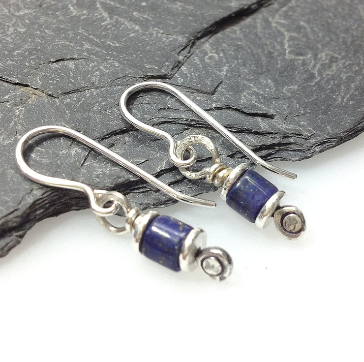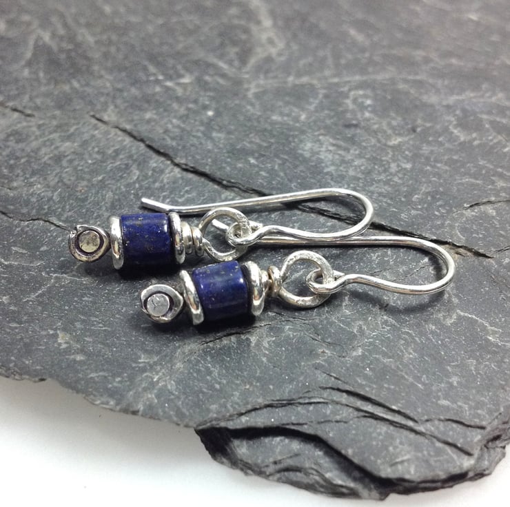 Forged sterling silver pins have been threaded through 5mm silver washer beads and bright blue lapis heishi.