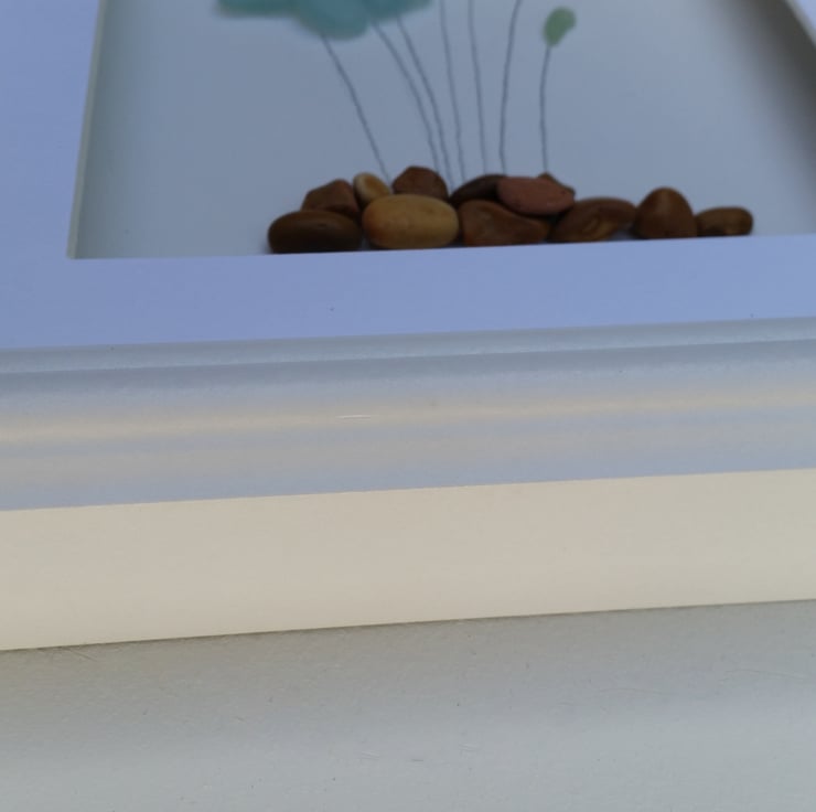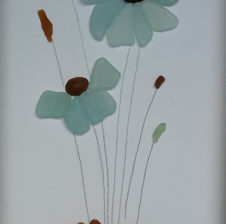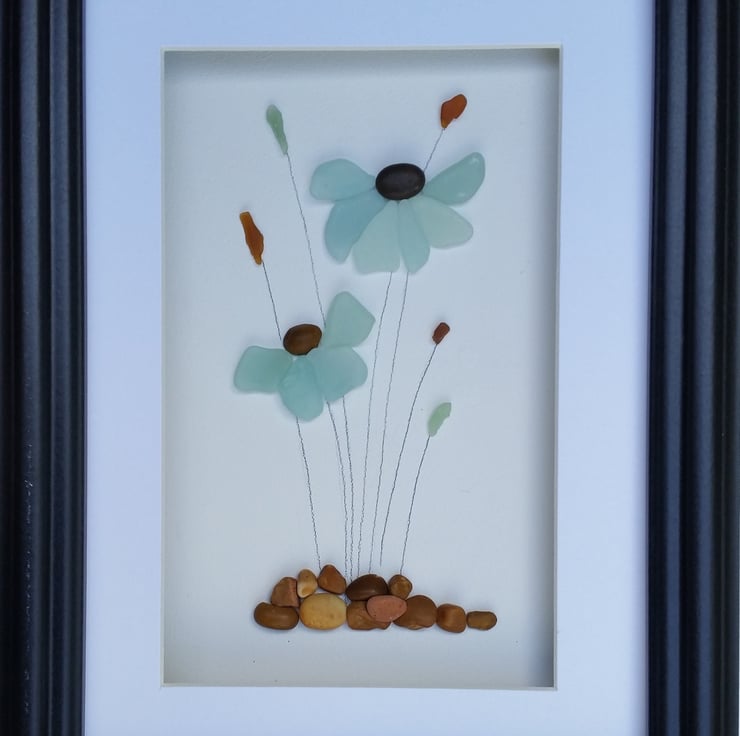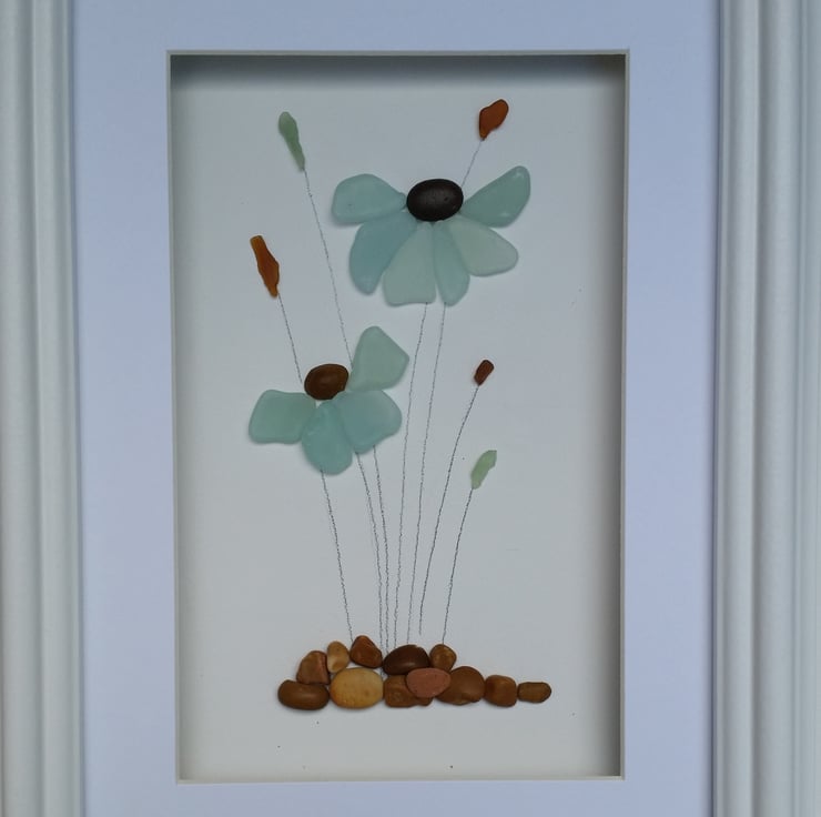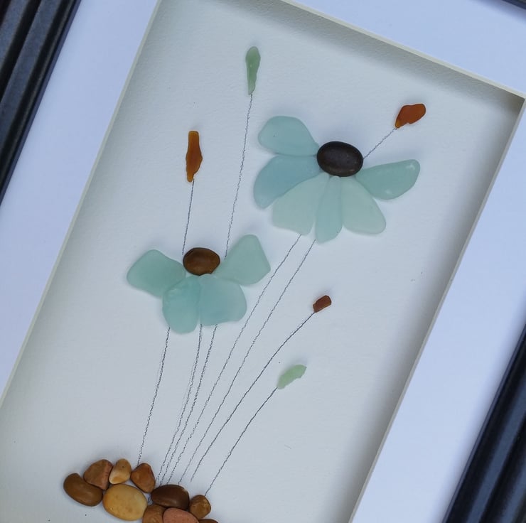 Beautiful blue nuggets of ocean smoothed Cornish sea glass make up these two flowers set inside a 35cm x 26cm glazed shadow box frame that is available in black or white.