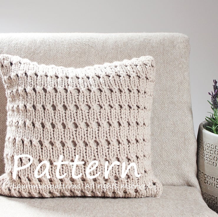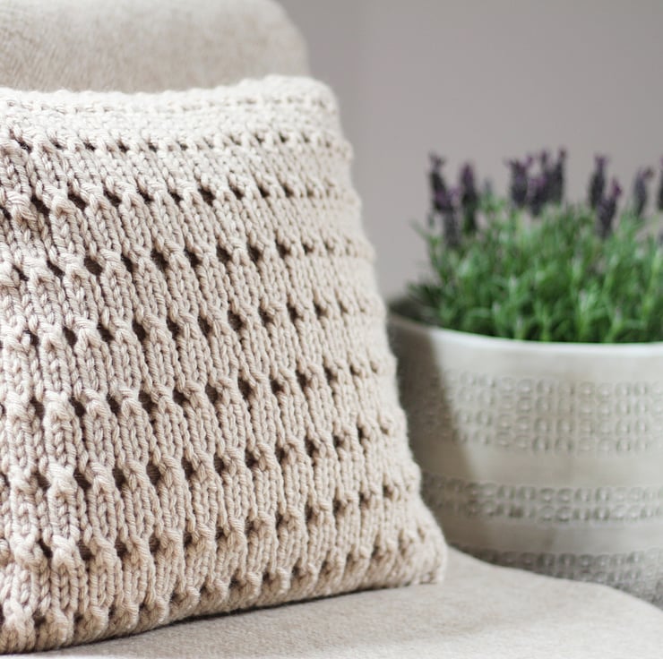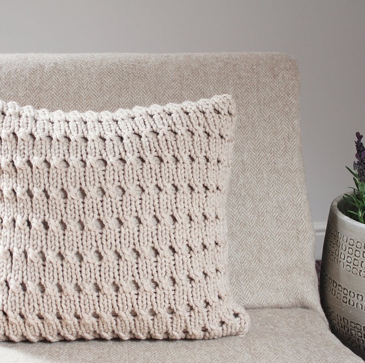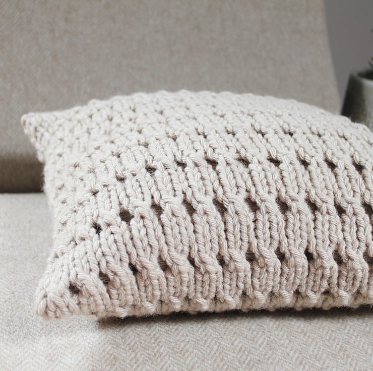 Hayfield pillow cover is knit up in super chunky yarn in a textured eyelet pattern.