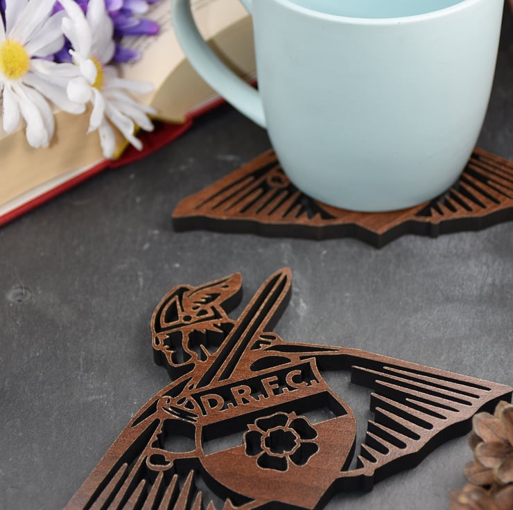 These Doncaster Rovers Coasters are finished to a very high standard using a high quality 8mm walnut veneered mdf.