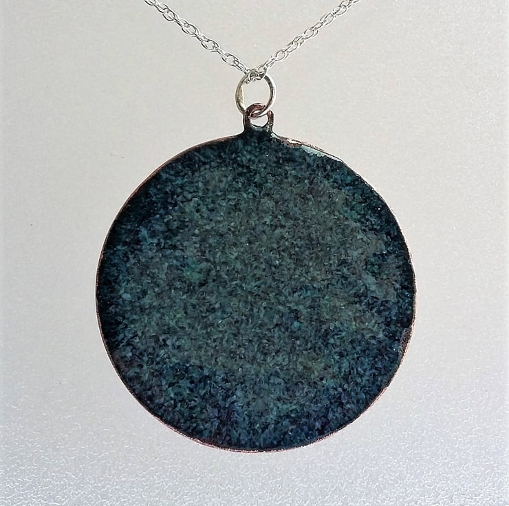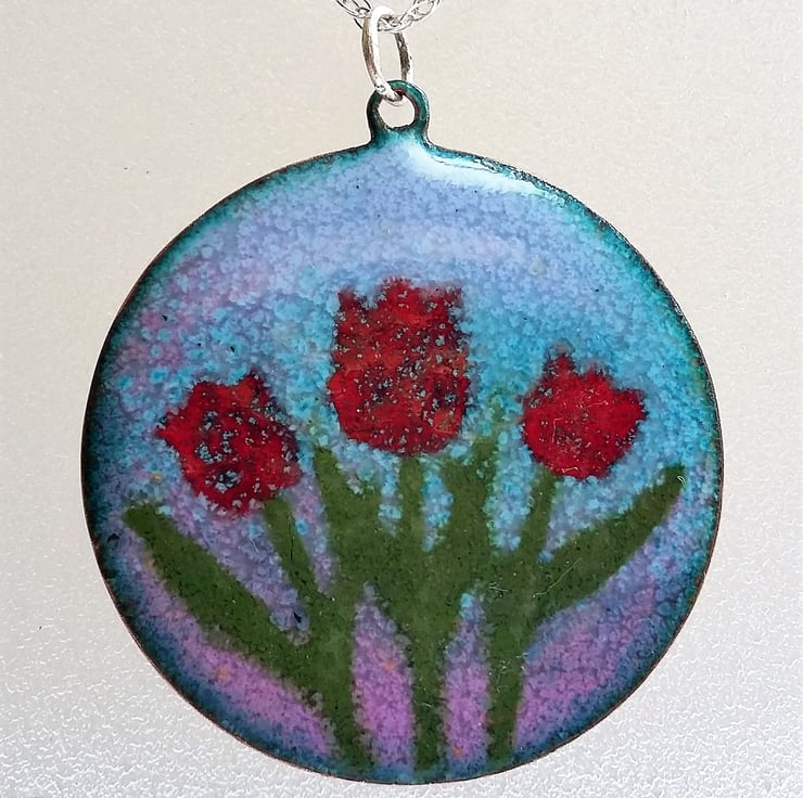 Large round enamelled copper pendant in pink, lilac and blue with a design of three red tulips. The pendant has been kiln-fired and measures approximately 40mm in diameter. The back has been enamelled to give a lovely dark blue tweed effect. It comes complete with an 18” sterling silver rope chain with a soldered sterling silver jump ring attached to the lug and is supplied with a little organza pouch. POSTAGE IS FREE!