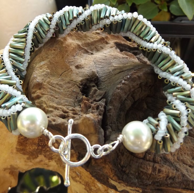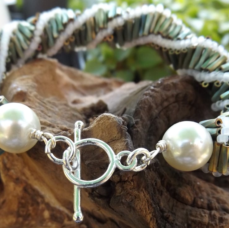 Bugle twist seeded beaded bracelet with green twisted bugle beads and white miyuki seed beads and two glass pearls with silver plated toggle clasp will fit wrist 6" and will come gift packaged