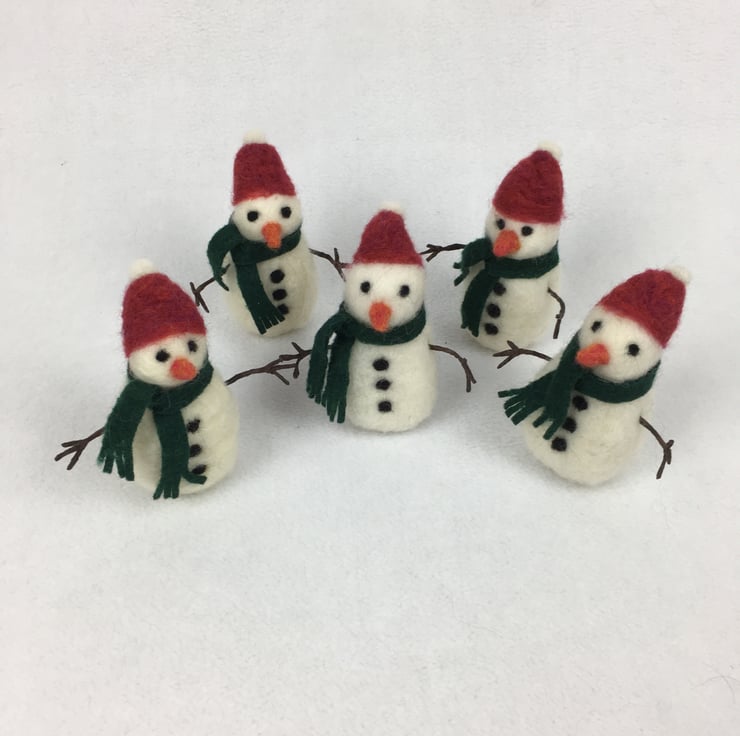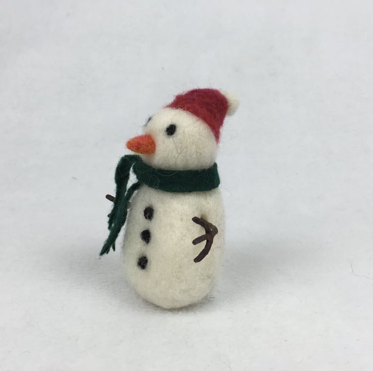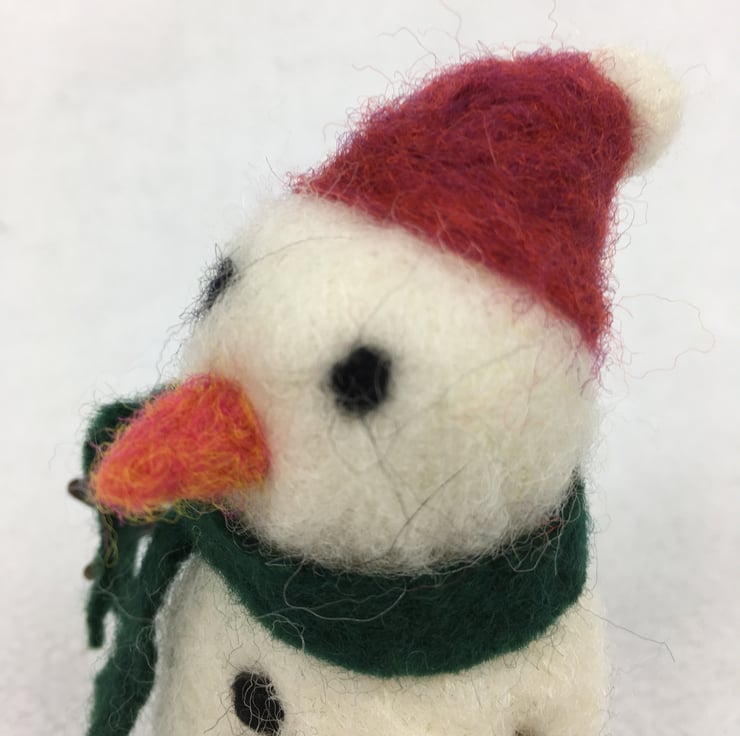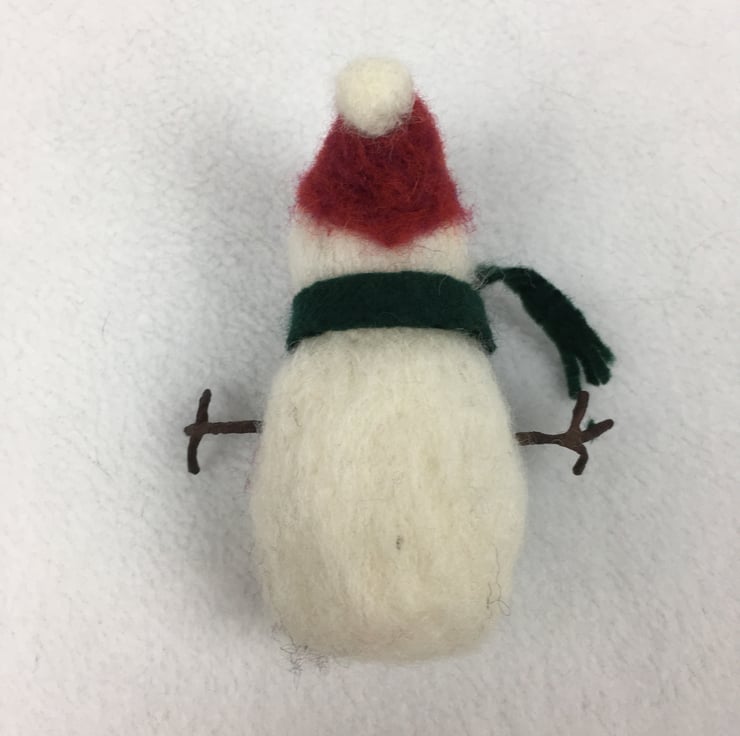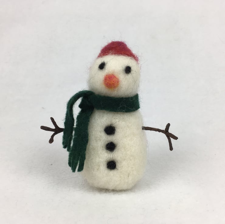 A cute little snowman needle felted using woollen fibres and a barbed felting needle. Equally suitable to use as a freestanding decoration or one to hang from the tree, the snowman stands approximately 10cm (4") tall. He has a red bobble hat and a green felted scarf. He has needle felted features and buttons. Wire covered with brown tape has been used to make his arms which are gently poseable. A small white wooden disc has been added to the base to add stability when freestanding and a nylon thread for hanging (easily removable if desired) has also been added.