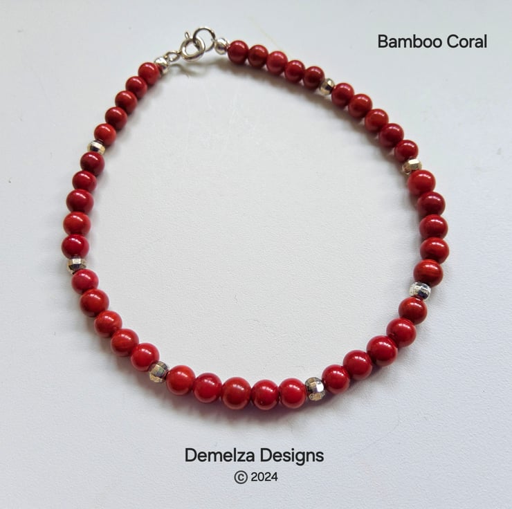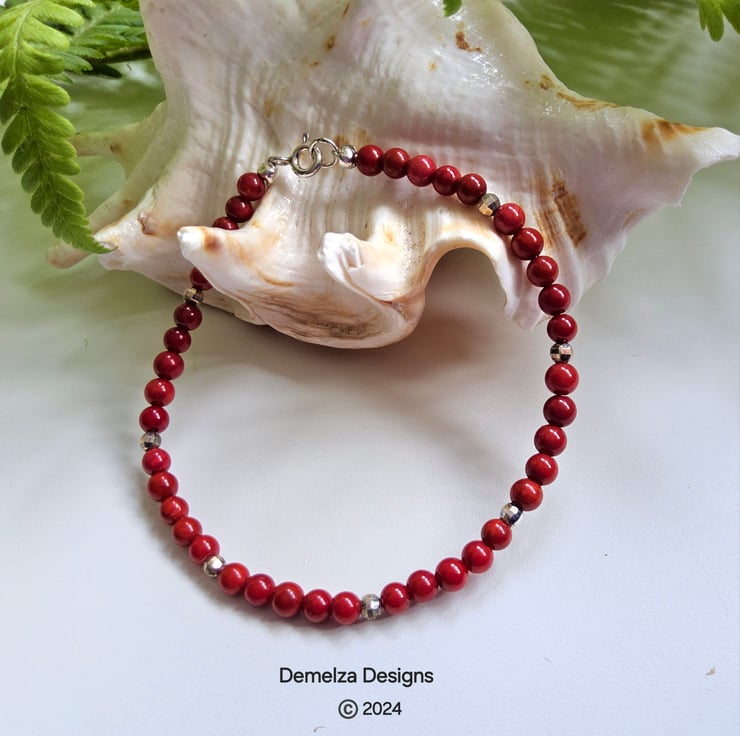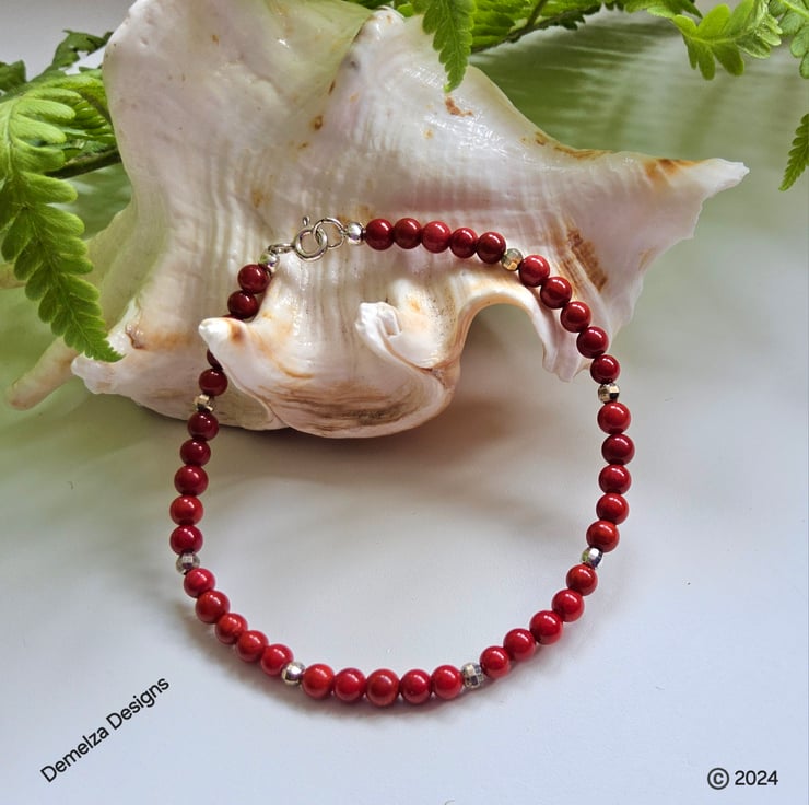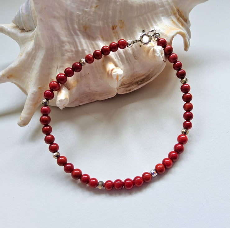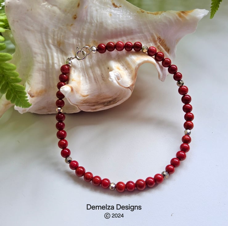 A lovely sweet stacker bracelet designed and hand crafted in Cornwall using small 4mm red coral gemstones, complimented with 925 faceted sterling silver beads for a touchof opulence and sparkle.