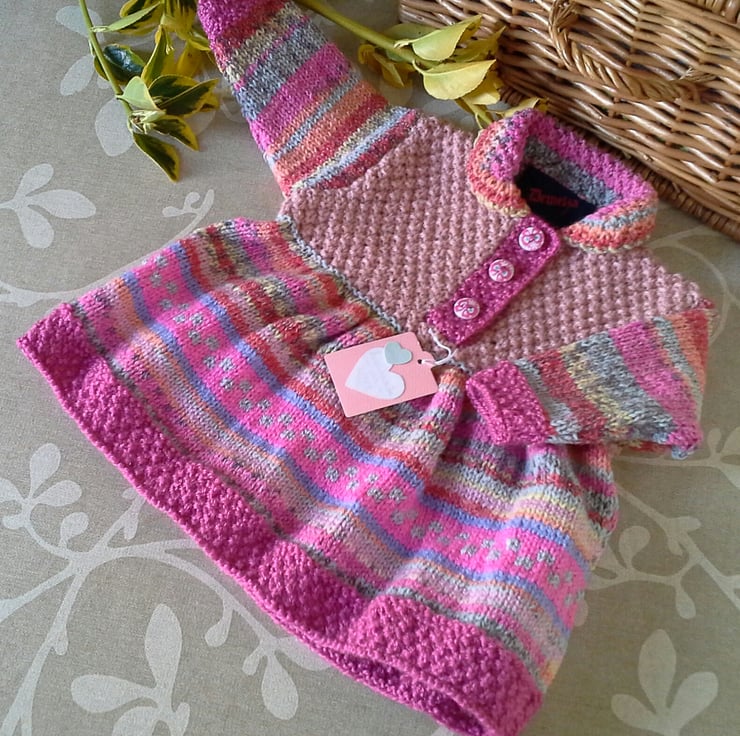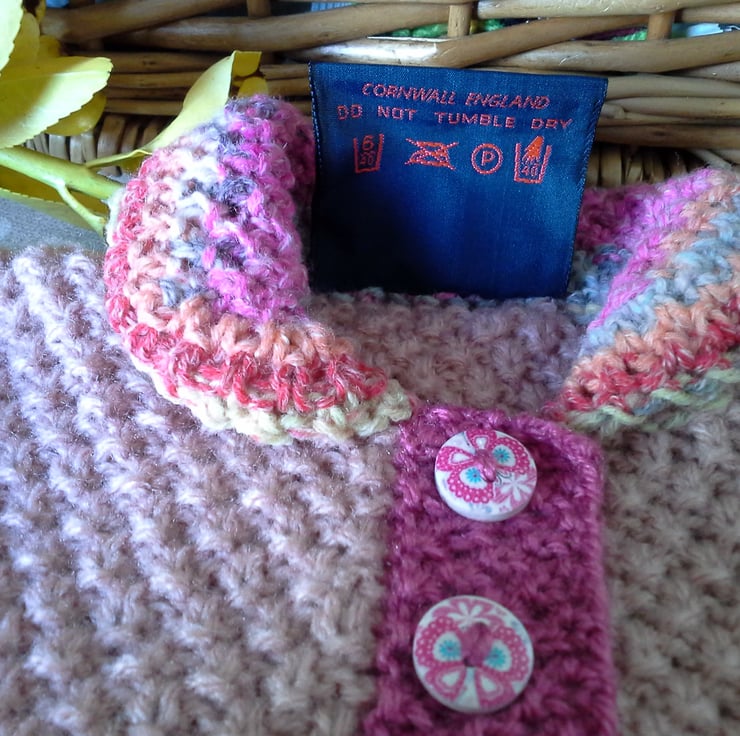 This pretty little baby girl's dress has been totally hand crafted by myself using quality British and French manufactured yarns. All yarns used are guaranteed machine washable at low temperatures. The buttons are made from genuine wood with a delicate floral print design on them. The designer branded Demelza garment label has been attached to the back neck edge as proof of it's origins with the care instructions woven within it for lasting reference.