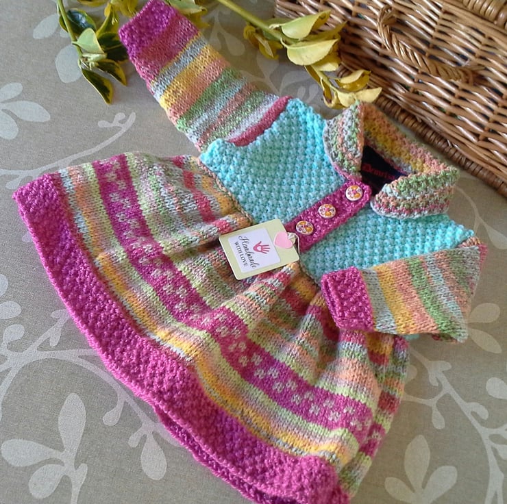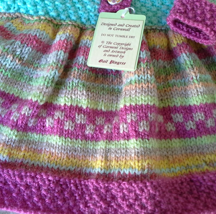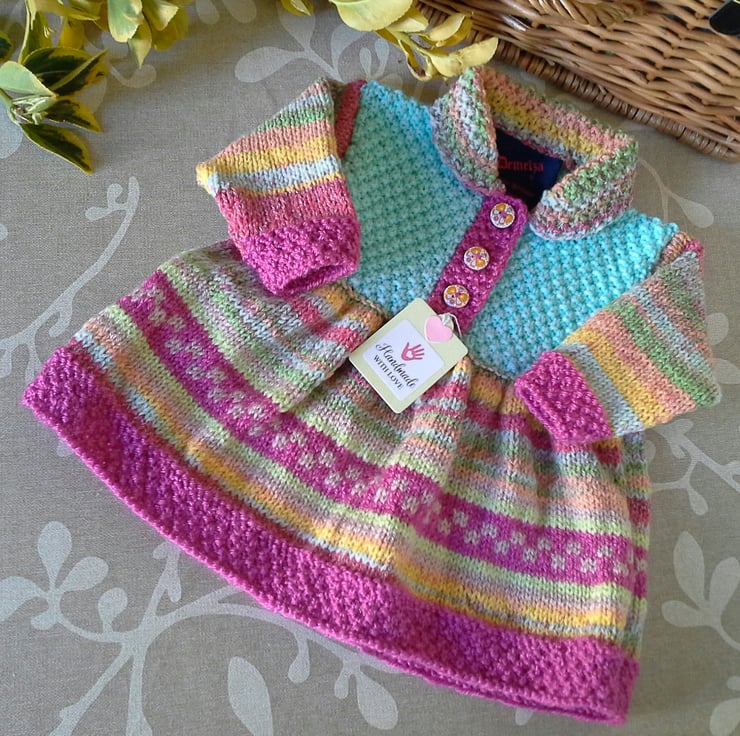 A very pretty unique knitted dress designed and totally hand crafted from start to finish by myself using quality British and French manufactured yarns. All yarns used are machine washable at low temperatures. The buttons are made from genuine wood with a delicate butterfly floral design on them. The branded Demelza garment label is attached to the back neck edge as proof of it's origins with the care instructions woven within it for lasting reference.