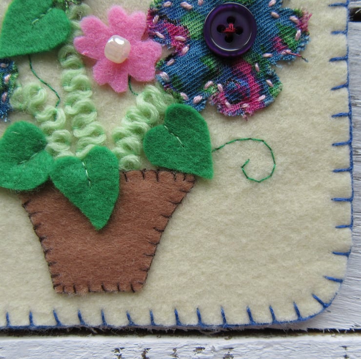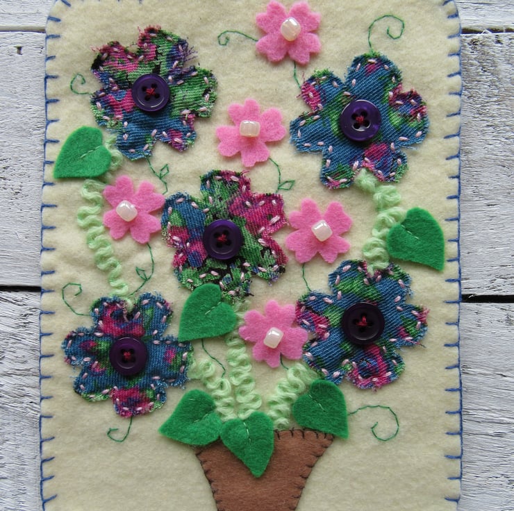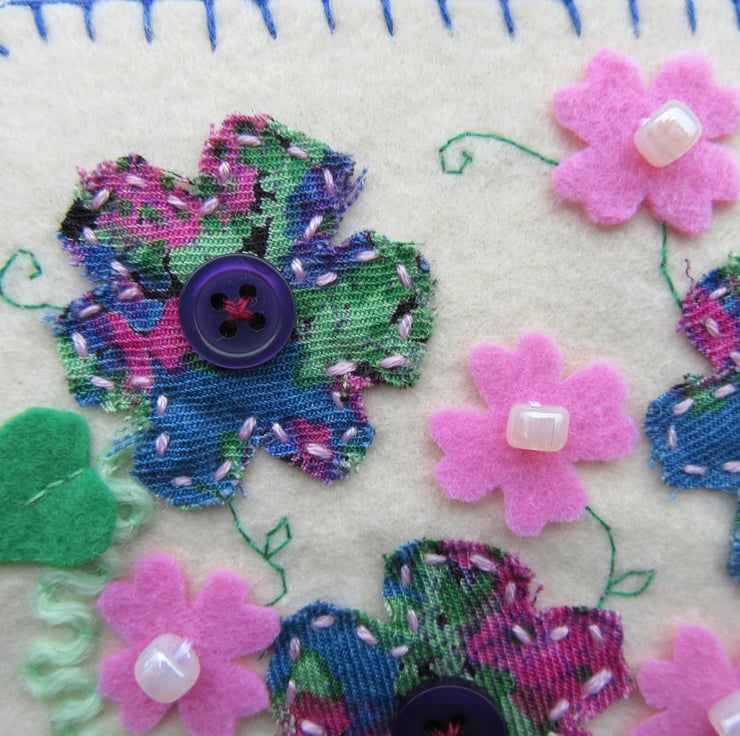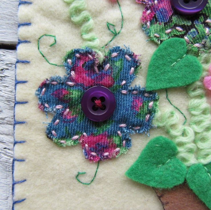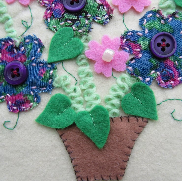 Unique flower wall hanging, a perfect gift for Mum, or a gift for a gardener. This one of a kind flower art is all hand stitched, with pink felt flowers, and pearl affect beads, patterned fabric flowers and dark purple buttons, green felt leaves, light green wool stems and hand stitched tendrils.