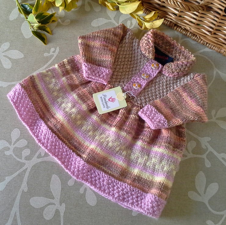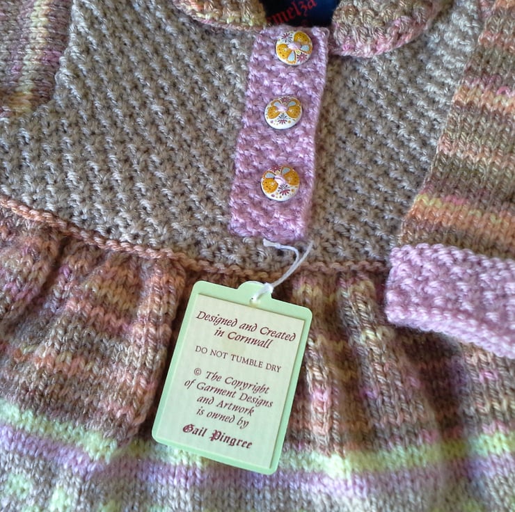 A very pretty unique baby girl's dress totally hand crafted from start to finish using branded quality French and British manufactured yarns. All yarns used are machine washable at low temperatures, short spin and dried flat for best results. The buttons are made from genuine wood with a delicate floral design on them. The branded Denelza garnent label is attached to the back neck edge as proof of it's origins with the care instructions woven within it for lasting reference.