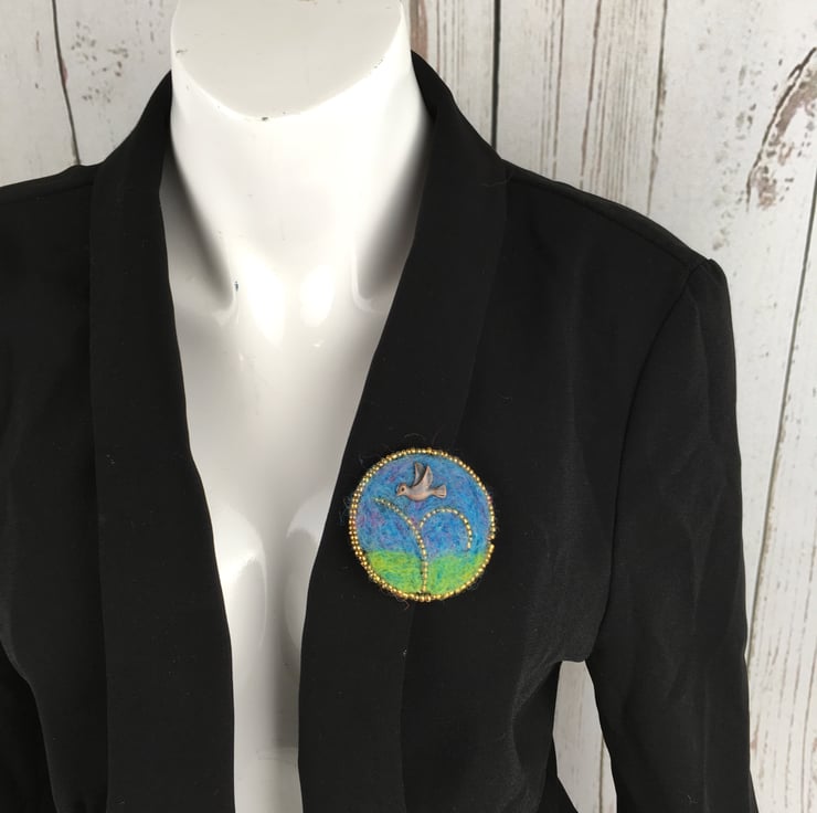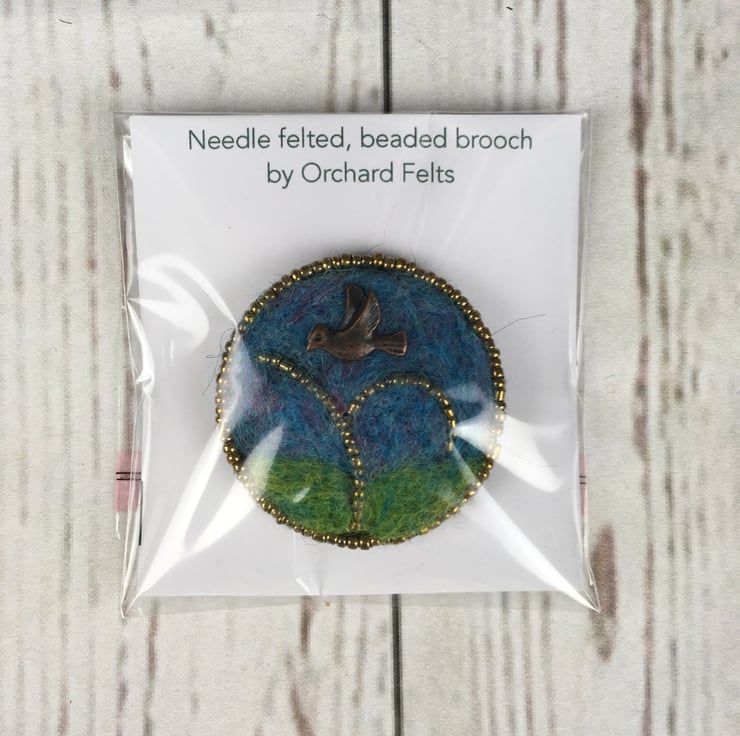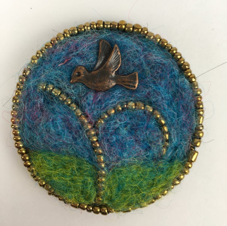 This bird brooch has been made using an outline of seed beads with the background needle felted using woollen fibres. An antique bronze effect bird charm has been added. Black commercial felt has been used on the reverse of the brooch and a brooch pin added.
