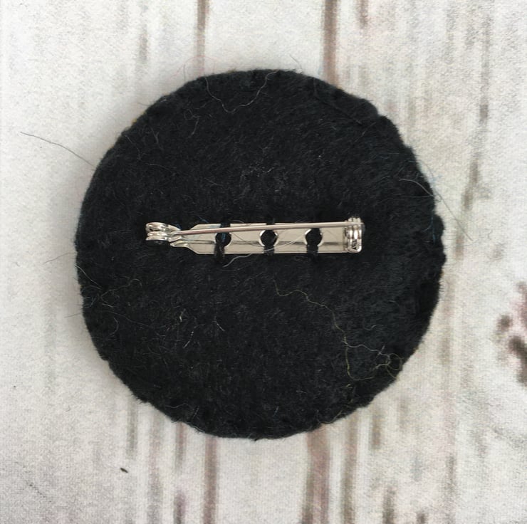 The brooch measures approximately 6cm (2.4“) in diameter and will arrive mounted on thick white card in a cellophane pouch.