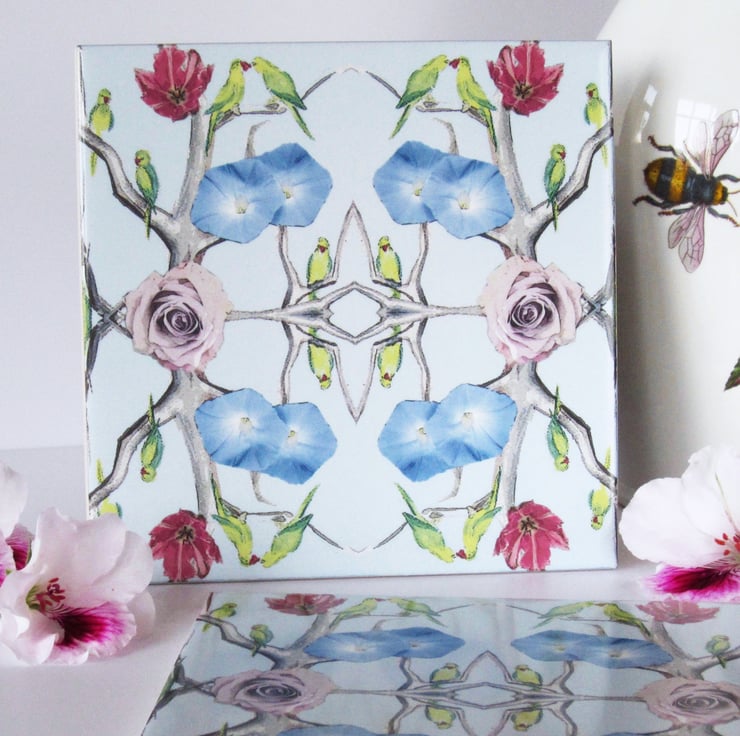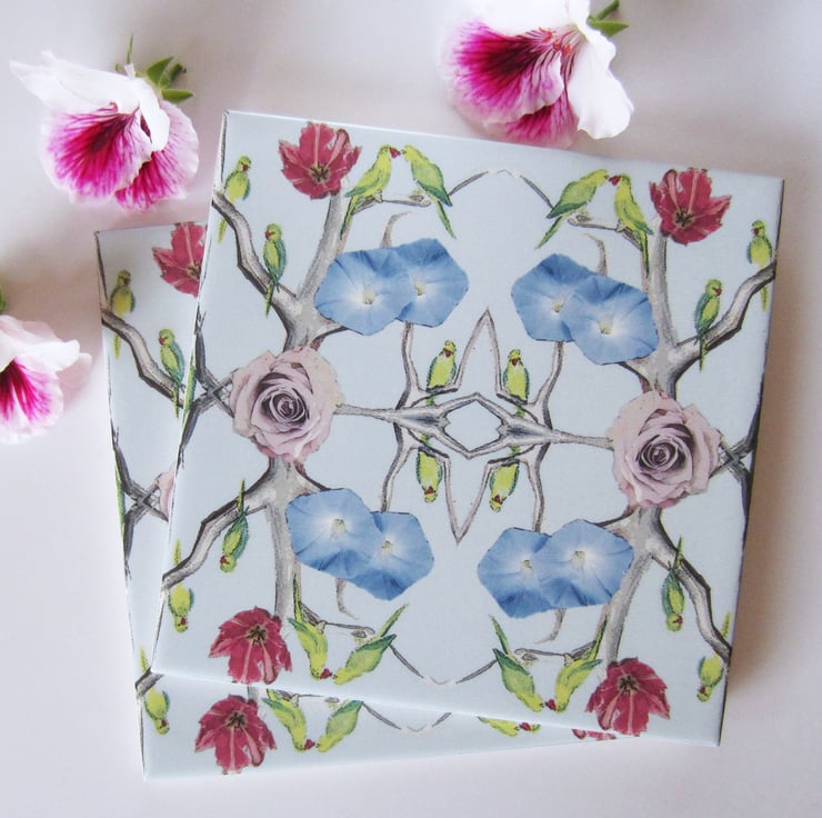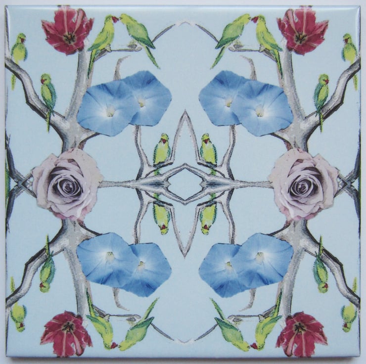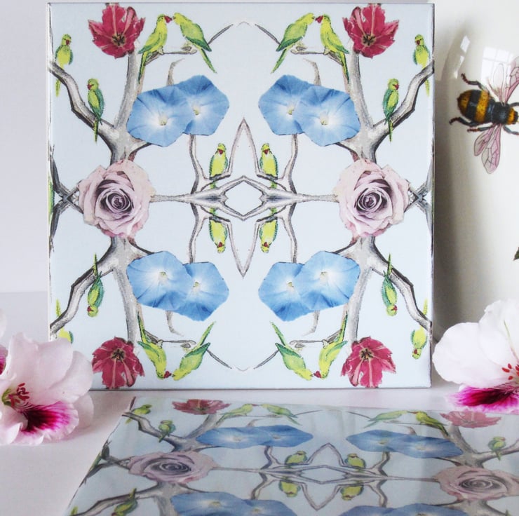 Parakeet and Flower Design Ceramic Tile Trivet with Cork Backing