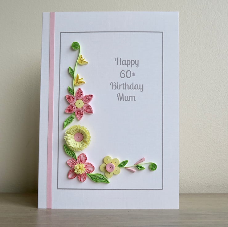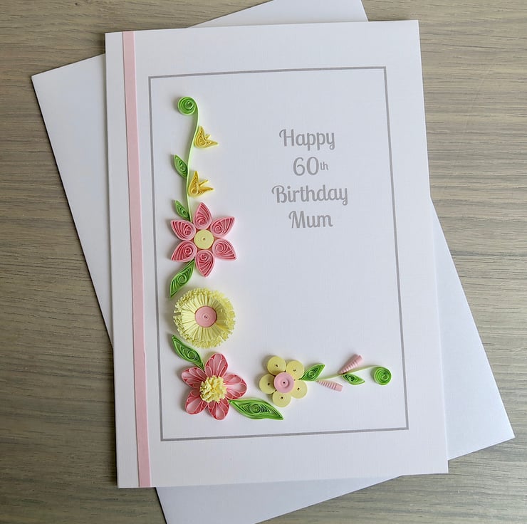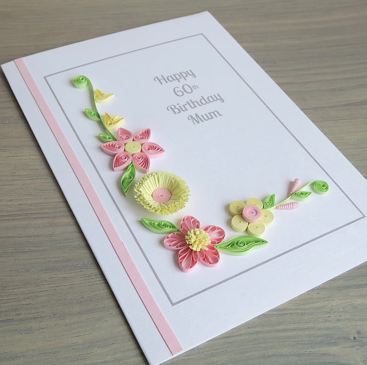 This card measures 6 ins x 8 ins approx. All the quilling on this card is handmade! Each petal, bloom and leaf is hand rolled from strips of coloured paper. The result is a beautiful original 60th birthday card which makes a great keepsake for the future. A beautiful handmade 60th birthday card with quilling flowers in pretty shades of lemon and pink.