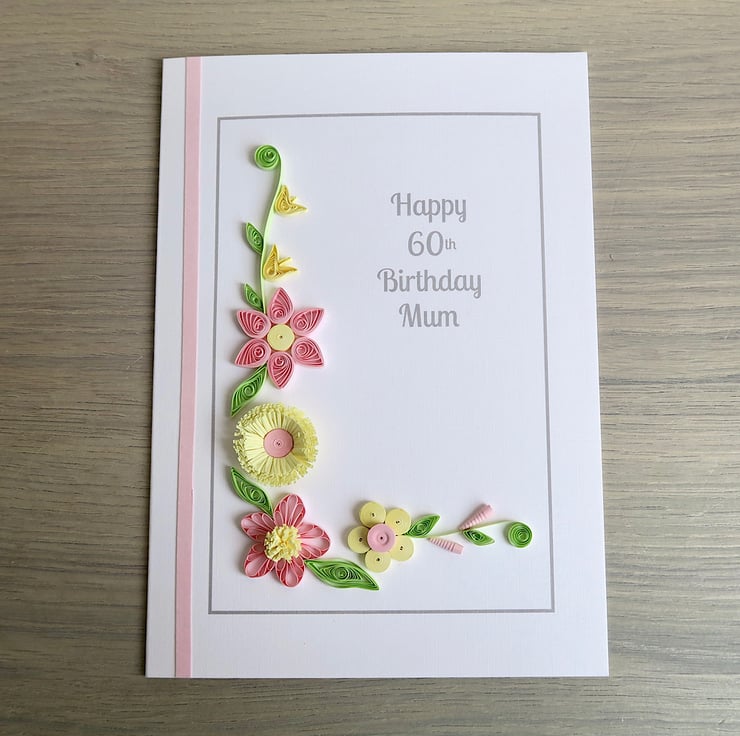 Handmade 60th birthday card with paper quilling flowers. Can be personalised for any age and any name - in fact, with any message you would like!