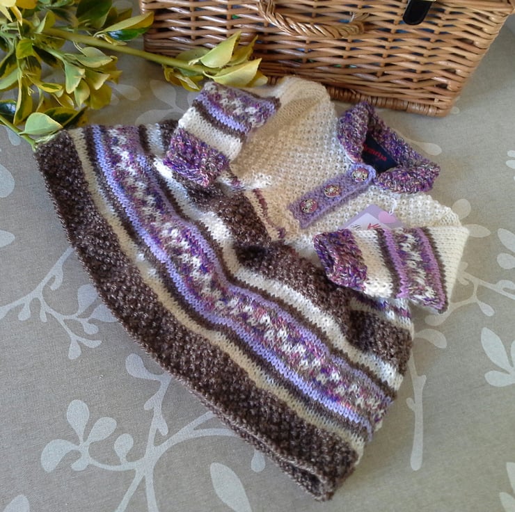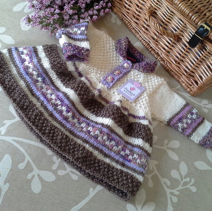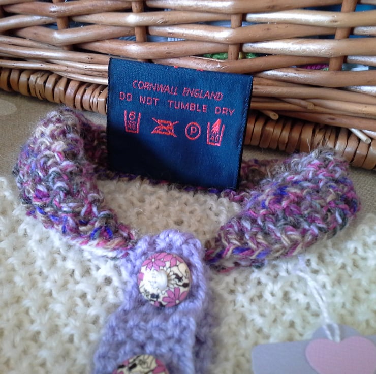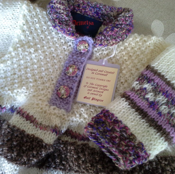 A very soft unique 'one off' baby girl's knitted dress totally hand crafted in Cornwall from start to finish using top quality branded British manufactured yarns. The yarns used are guaranteed machine washable at low temperatures, short spin, dried flat away from extreme heat for best results. The buttons are made from genuine wood with a delicate floral design on them for added interest on the front of the dress. The branded Demelza garment label has been attached to the back neck edge as proof of it's origins with the care instructions woven within it for lasting reference.