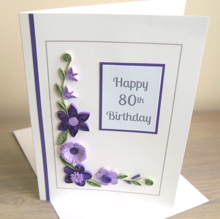 Celebrate a special milestone birthday by sending this beautiful handmade quilled 80th birthday card with quilling flowers in pretty shades of purple.