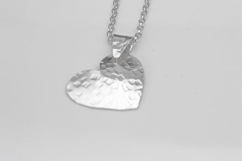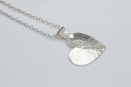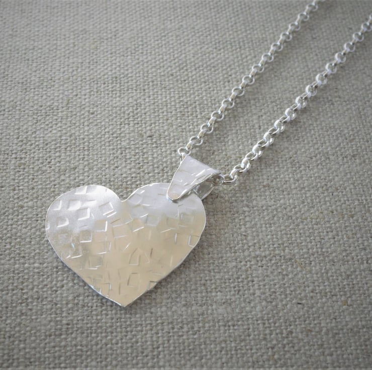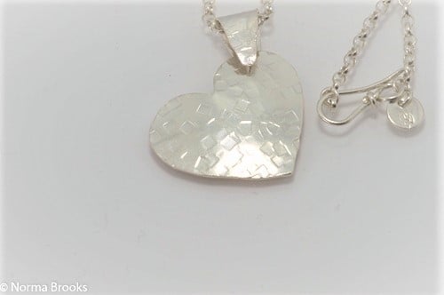 I have used sterling silver sheet that is 0.7 mm thick to create this heart pendant. The heart shape has been textured using a hammer then slightly domed. It measures 30 mm x 25 mm. The articulated bail, which measures 12 mm long and 10 mm wide, has been textured in the same way and attached to the heart slightly off centre. The overall drop of the heart and the bail is 35 mm. I have added an unusual sterling silver 18 inch (45 cm) chain the detail of which can be seen in the pictures.