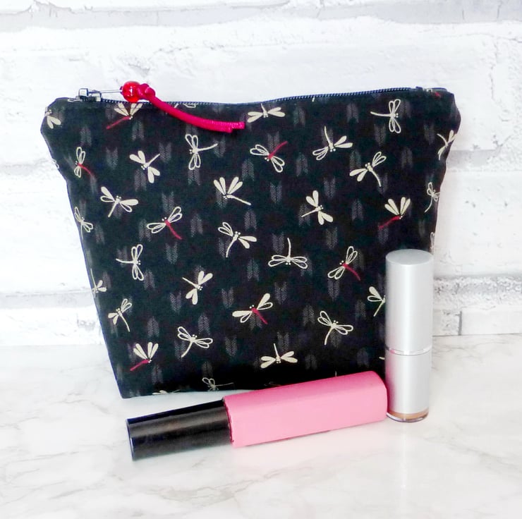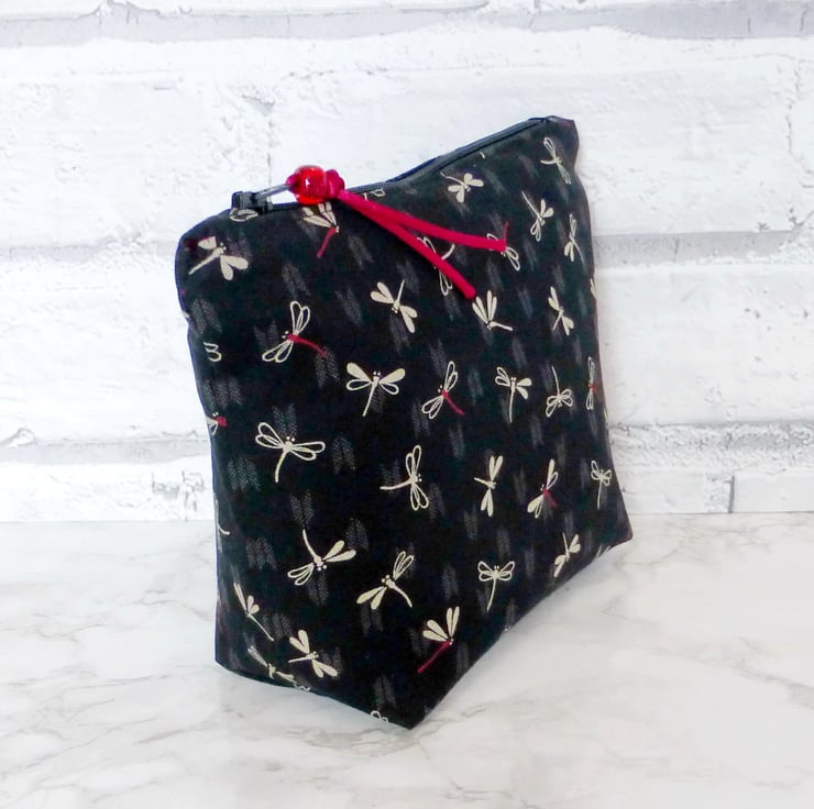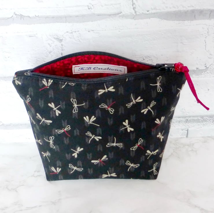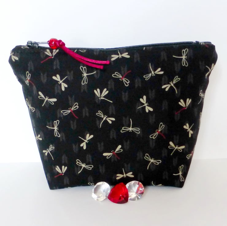 A medium sized make up bag/zipped pouch made from cotton fabric. The main fabric has a black background with beige coloured dragonflies on it. Some of the dragonflies have red bodies to add a little spot of colour. The lining is a patterned red cotton fabric.