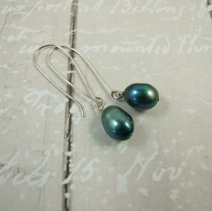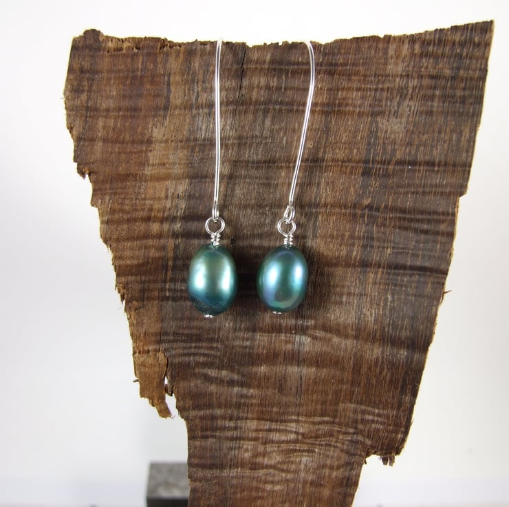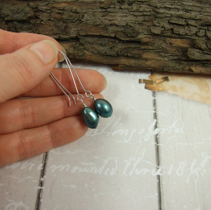 Hand crafted long drop ear wires paired with Peacock Teal 10mm Pearls and my own handmade sterling silver bead wires.
