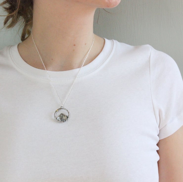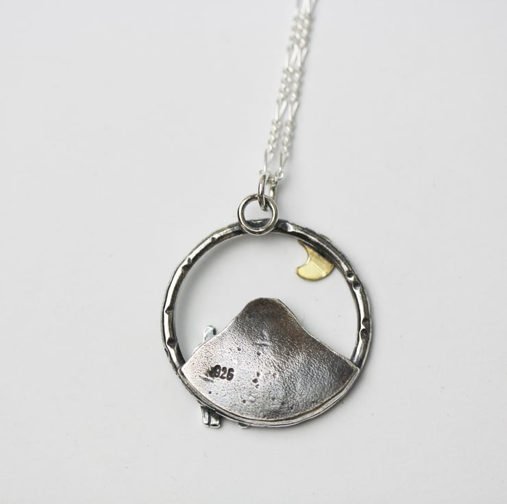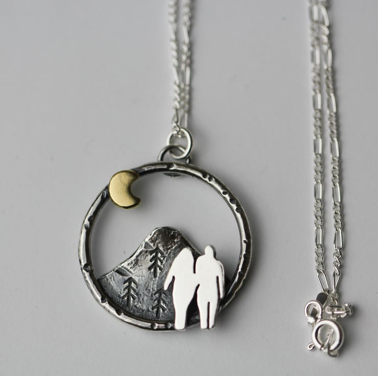 The mountain has been textured, and features tree designs. The mountain and ring has been given an oxidised finish, to create a darker tone.