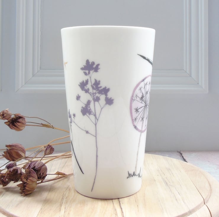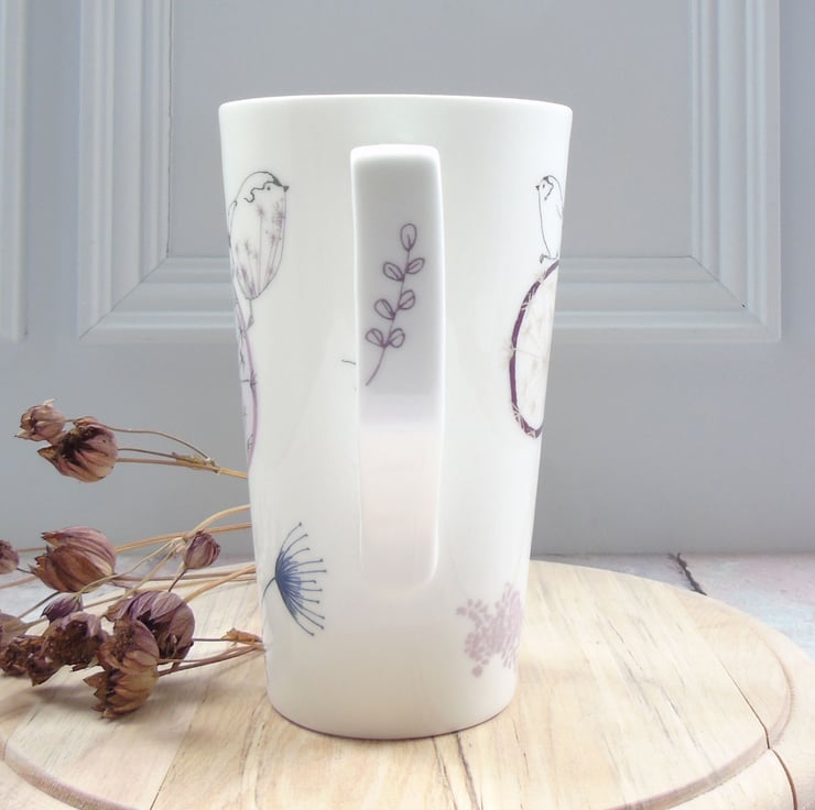 A tall, cone shaped bone china latte mug hand decorated with ceramic transfers of my illustrations of birds and botanical imagery. An elegant way to take your morning coffee or mid afternoon break with a slice of cake.