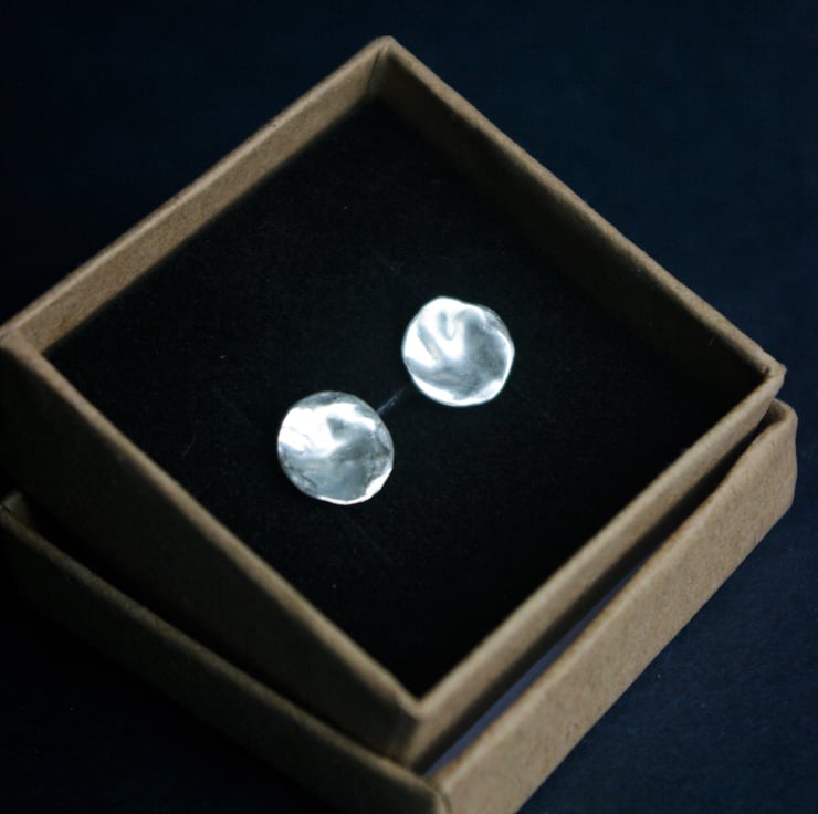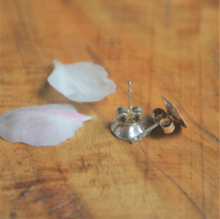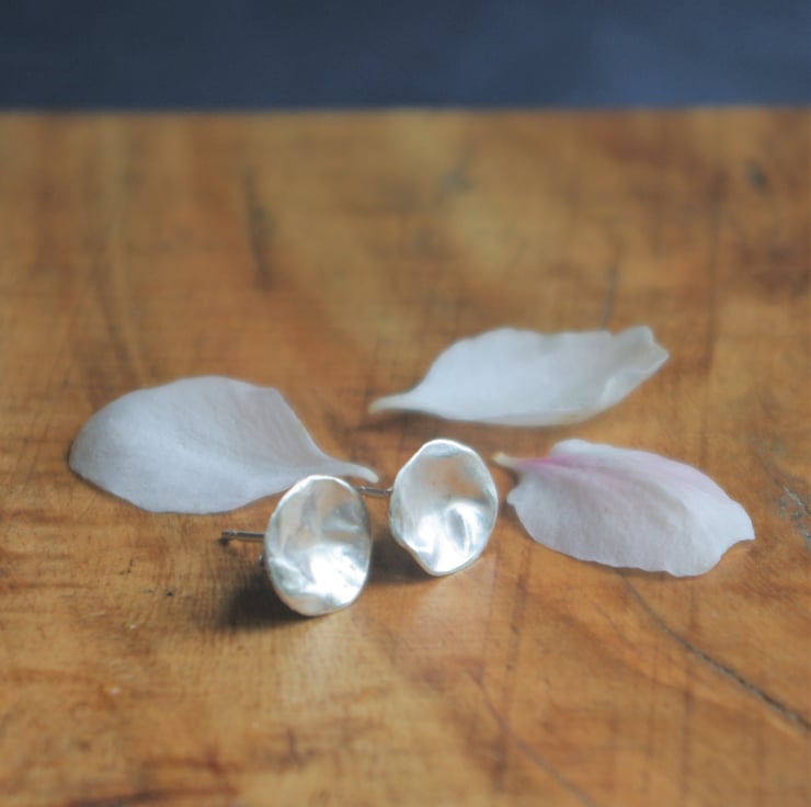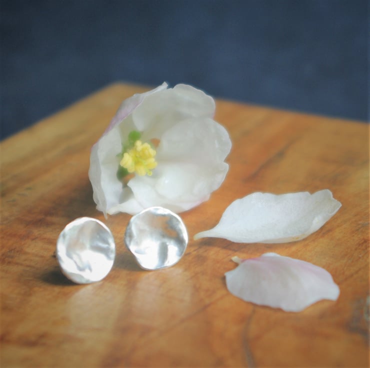 I have given a circle of sterling silver, with a diameter of 10mm, an organic, crumpled look like blossom petals. The earposts and butterfly backs are sterling silver.