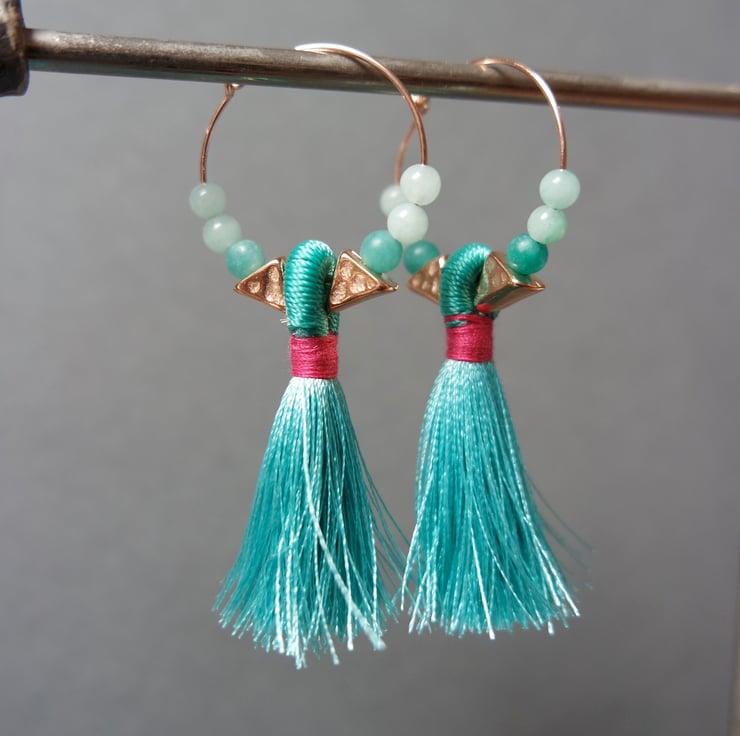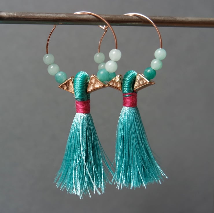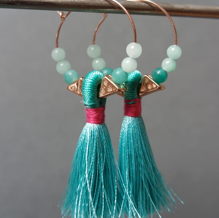 Chic and colourful! 14k rose gold-filled hoops with a beautiful tassel in vibrant summer colours, rose-gold plated triangle beads and colour matching quartz beads.